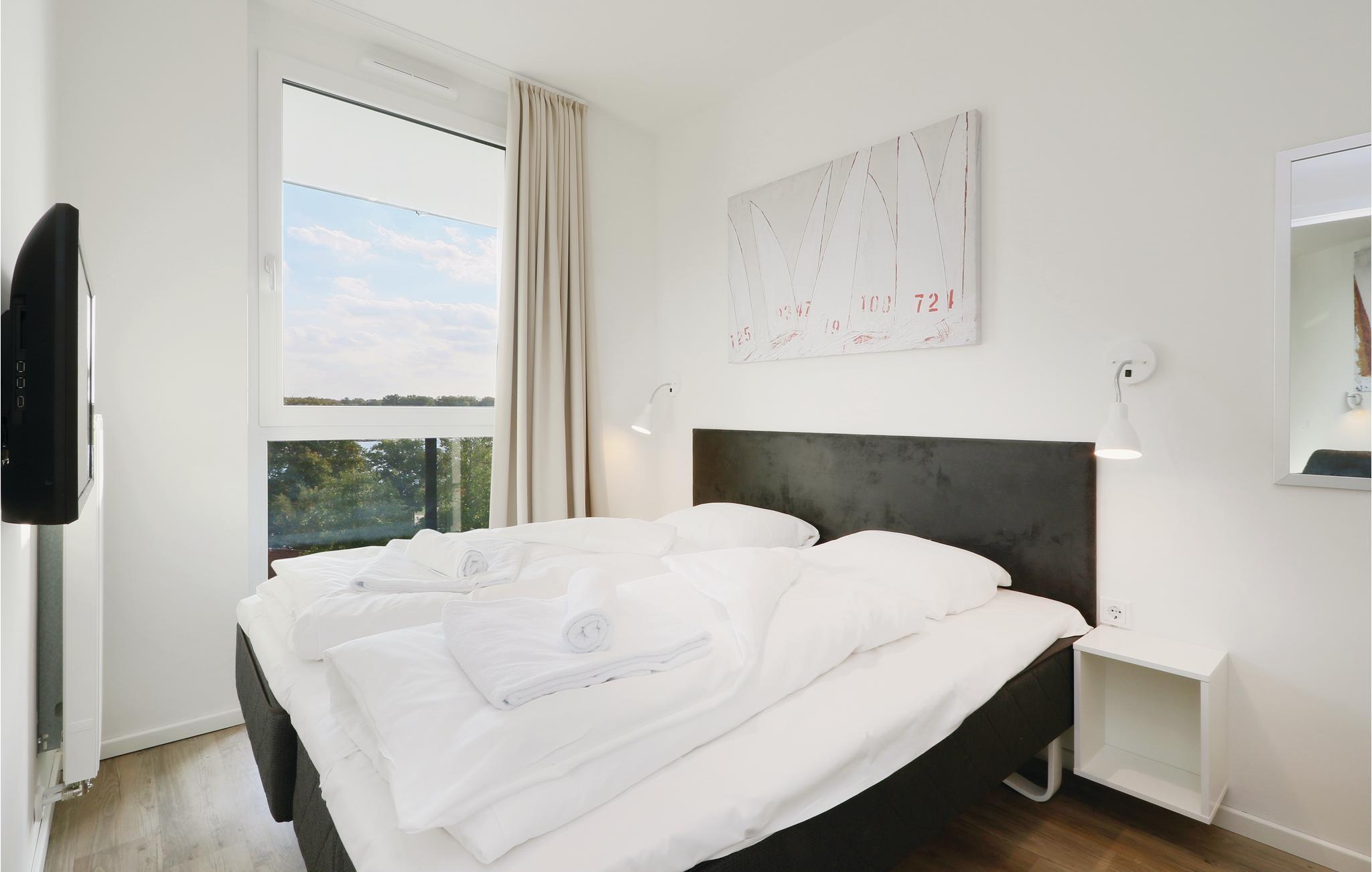 Ihre Ferienwohnung befindet sich im 4. Obergeschoss der Anlage, weshalb Sie eine einmalige Aussicht genießen. Von hier aus können Sie auf den Priwall, den Sandstrand sowie die Hafenausfahrt mit den vorbeiziehenden Schiffen blicken. Sie verfügt über zwei separate Schlafzimmer mit jeweils einem gemütlichen Doppelbett. Im Wohnbereich können Sie es sich vor dem wohligen Licht des Bio-Ethanol-Kamins gemütlich machen. Im Wohnbereich befindet sich außerdem das Schlafsofa, welches zwei weitere Schlafplätze bietet. Ein Kinderbett lässt sich ausschließlich im Wohnzimmer aufstellen, da im Schlafzimmer nicht ausreichend Platz zur Verfügung steht.