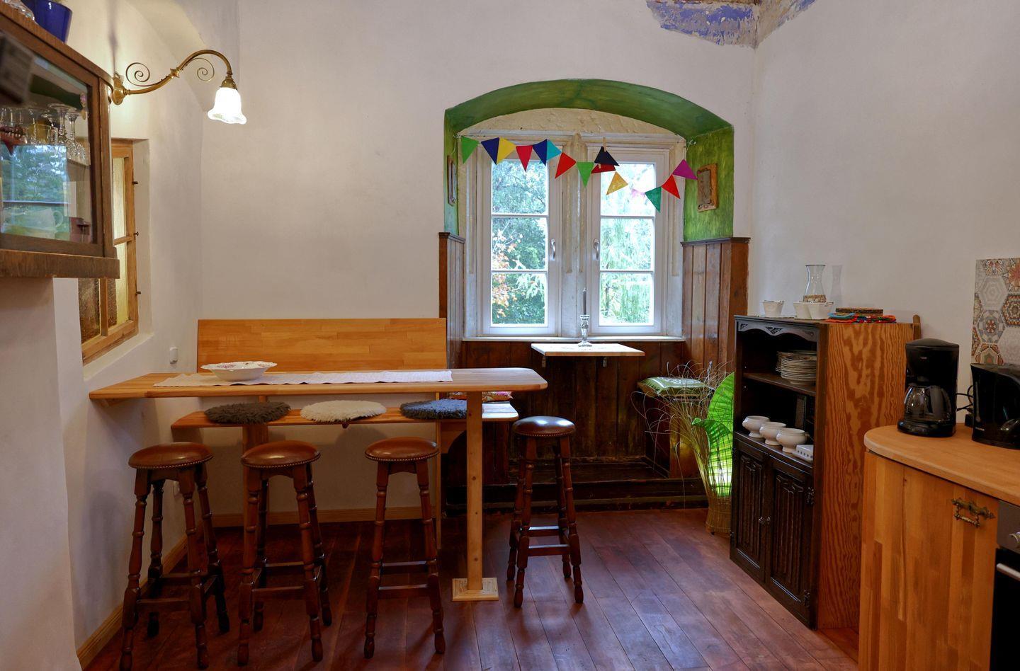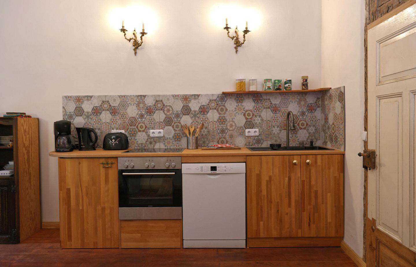 Die Unterkunft verfügt über zwei voll ausgestattete Küchen: Eine großzügige Wohnküche mit Geschirrspüler, Herd, Backofen, Kühlschrank und allem, was Sie fürs gemeinsame Kochen benötigen, sowie ein gemütliches Küchenstudio – perfekt für den ersten Kaffee am Morgen oder kleine Mahlzeiten zwischendurch. So lässt sich der Aufenthalt flexibel und entspannt gestalten.