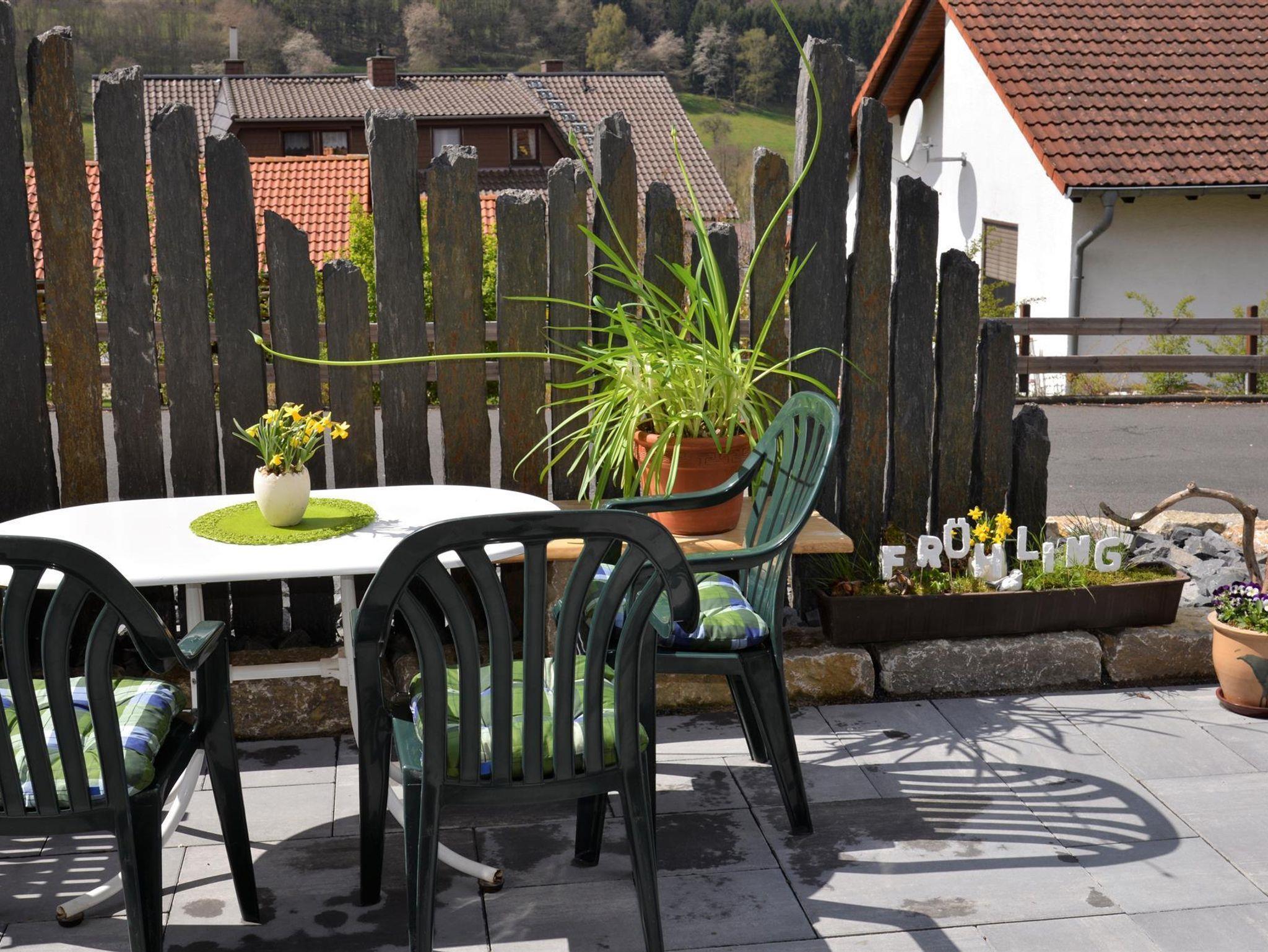 Die große Sonnenterrasse (20 qm) mit Stühlen, Tisch, Sonnenliegen und Sonnenschirm lädt zum Ausspannen, Ruhe finden und Genießen ein.