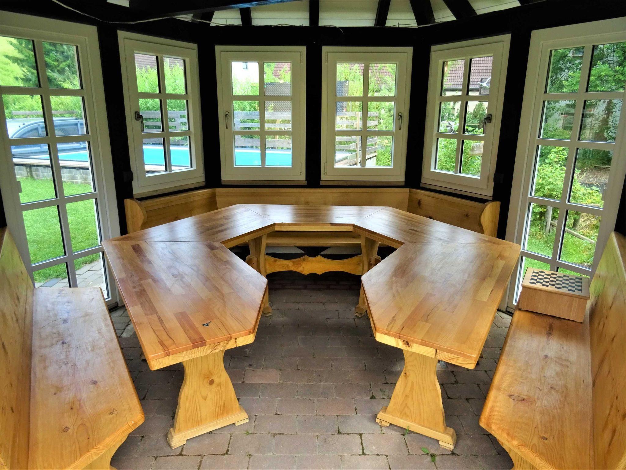 Pavillon als Gemeinschaftsraum mit integrierter Feuer- und Grillstelle. (Auch im Winter).