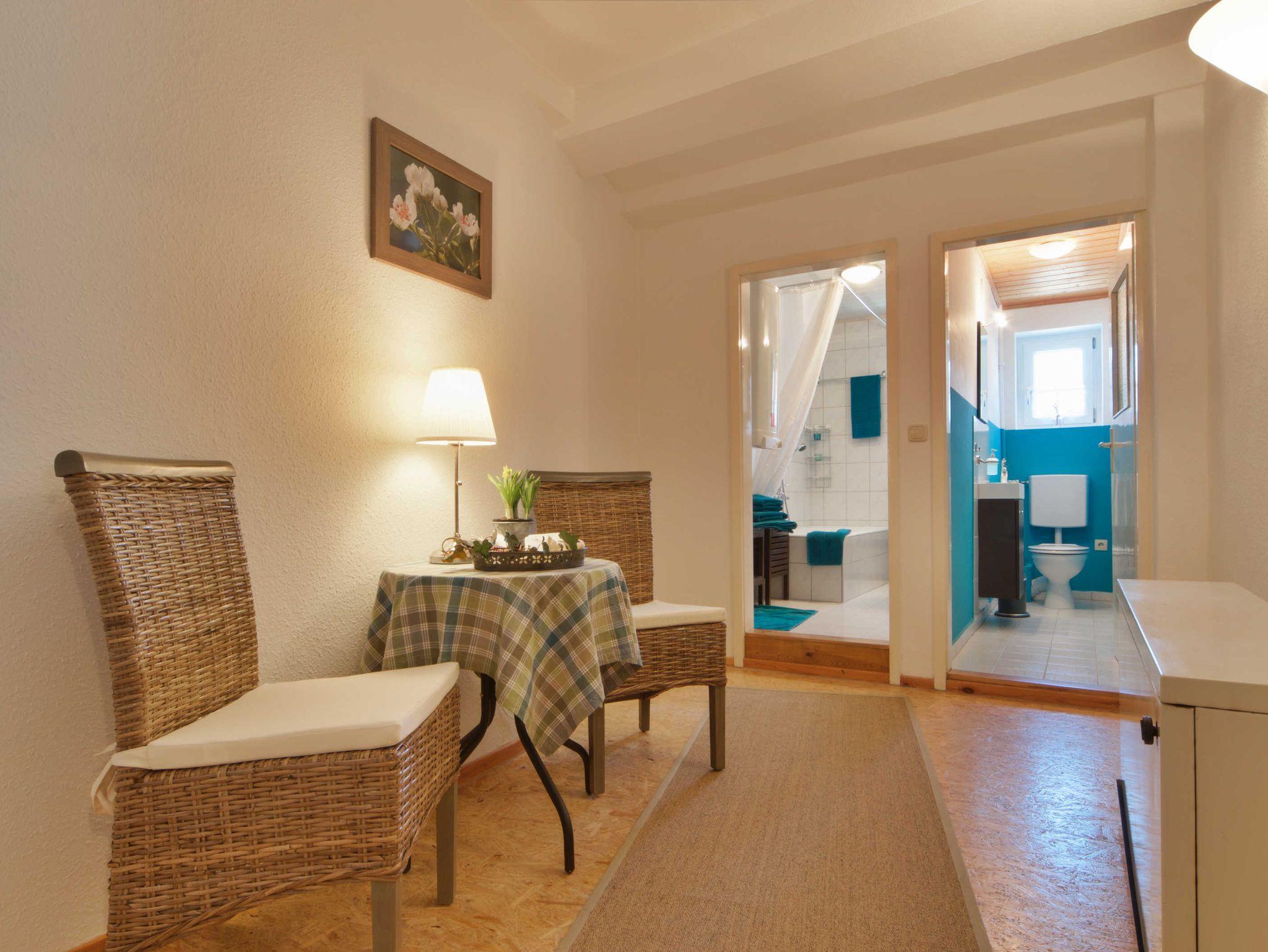 Auf 80qm bietet Ihnen unsere gemütliche Ferienwohnung eine geräumige Wohnküche, ein Schlafzimmer für 2 Personen, ein Wohn-Schlafzimmer für 2 weitere Personen, Badezimmer, separates WC und eine weitere Sitzgelegenheit im Flur.