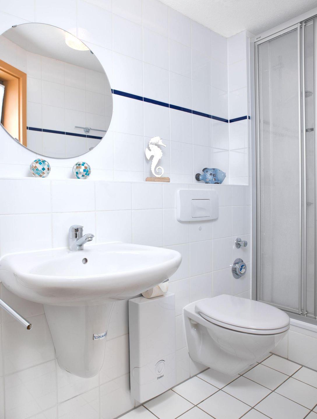 Das Bad ist mit Dusche und WC ausgestattet.