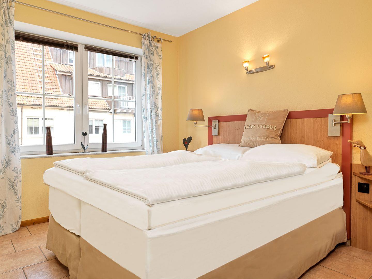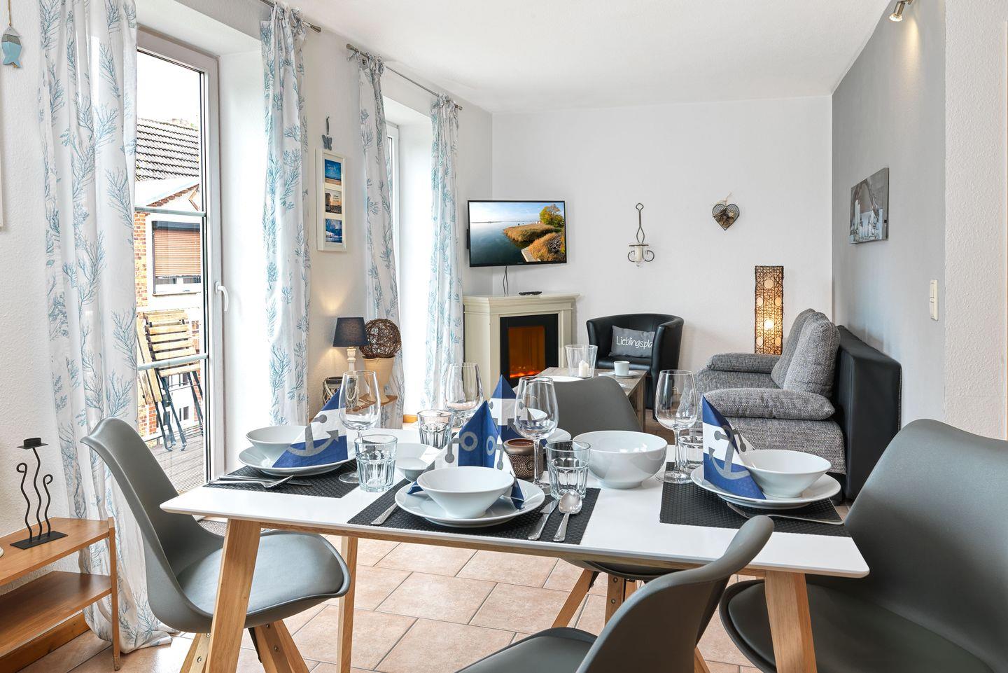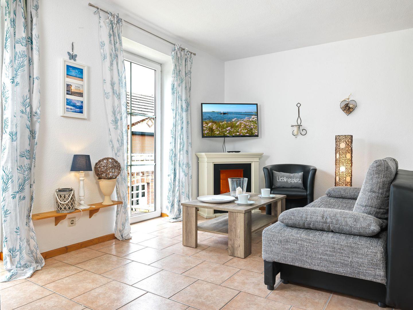 Ein Schlafzimmer mit Doppelbett und ein Schlafsofa im Wohnzimmer bieten Platz für bis zu 4 Personen für ihren Urlaub. Das gemütliche Wohnzimmer ist mit Flach-TV/Radio, einem elektrischen Kamin und einem Balkon mit Gartenmöbeln ausgestattet. In der offenen EBK mit Esstisch befindet sich ein Kühlschrank, Herd mit Ceranfeld, Wasserkocher, Toaster und Kaffeemaschine. Das Bad ist mit Dusche und WC ausgestattet.