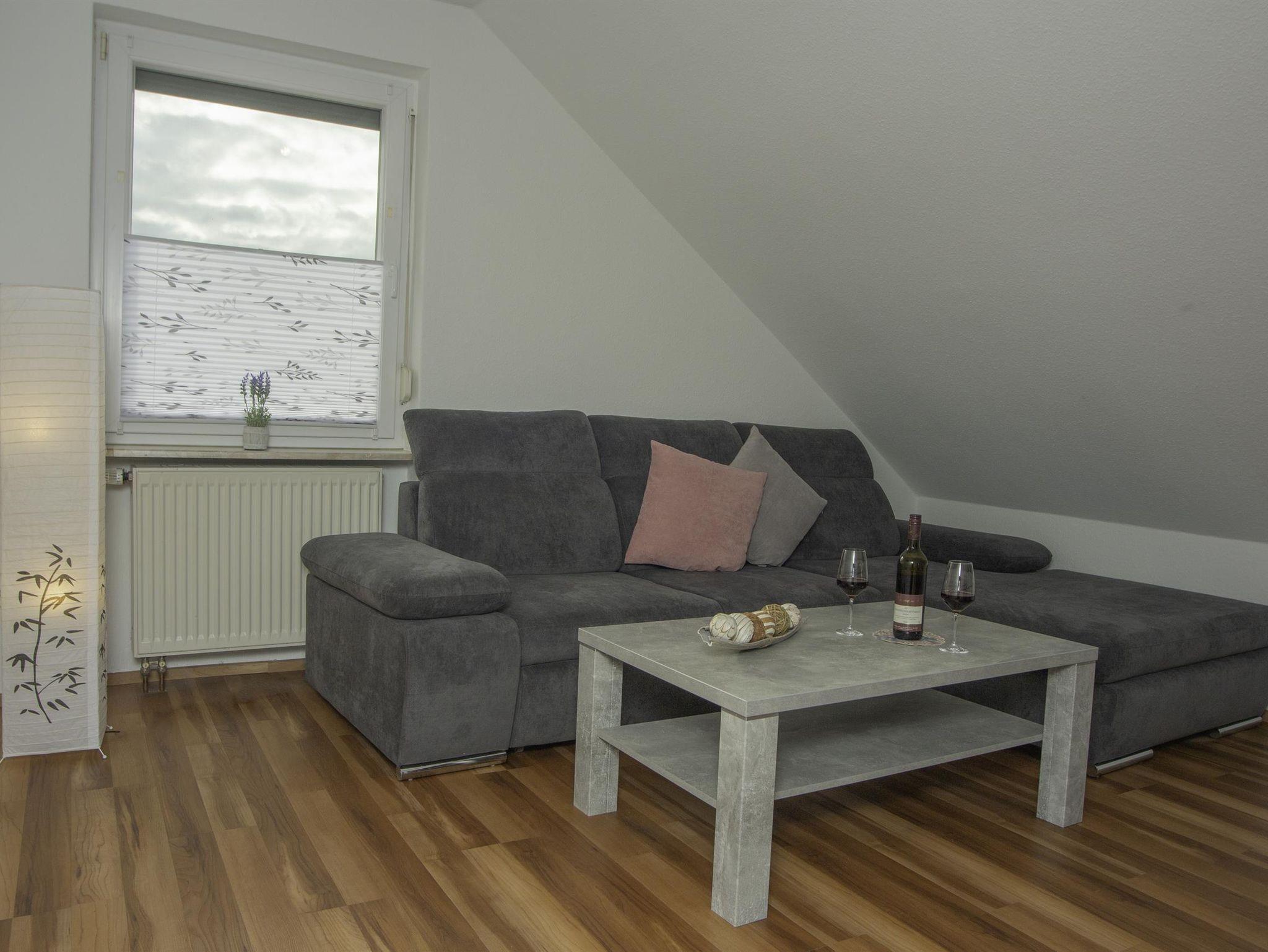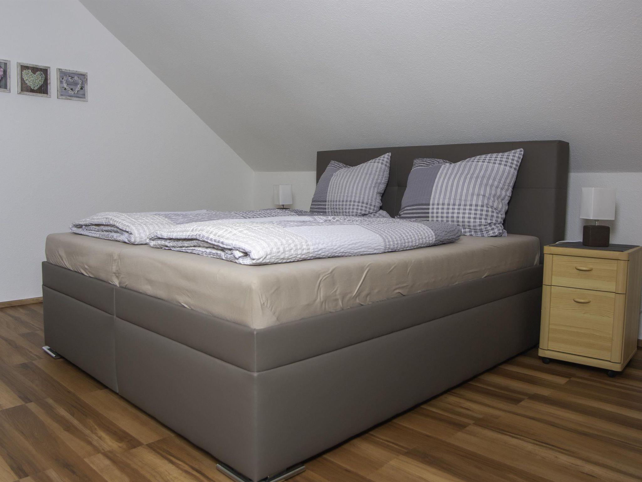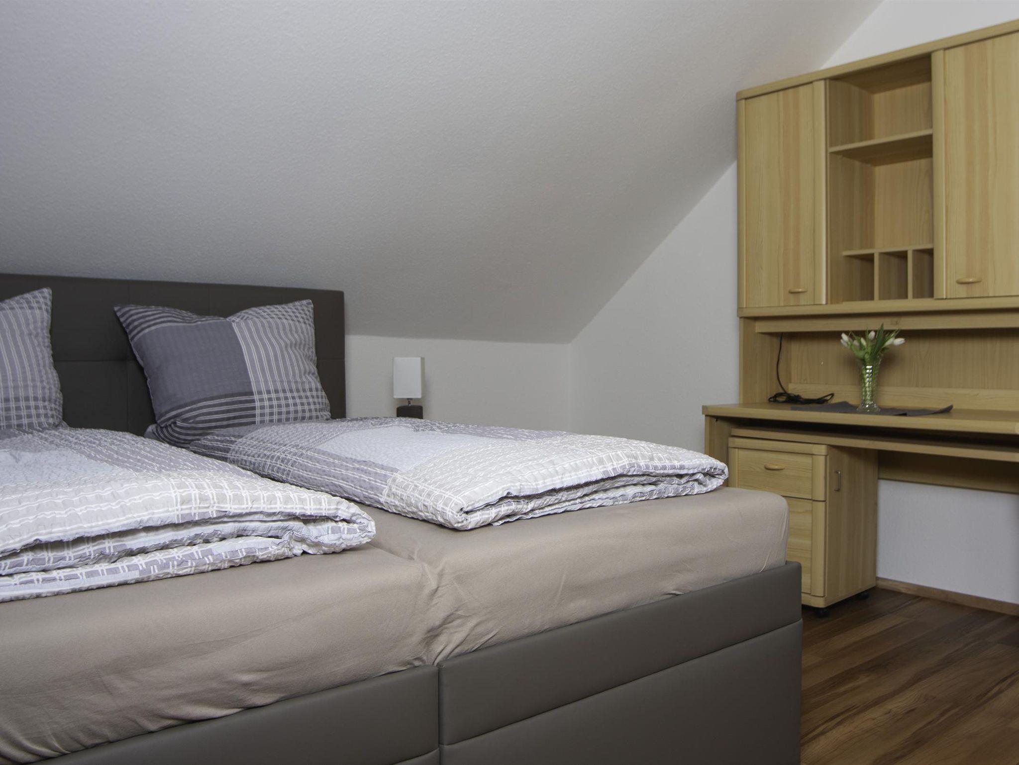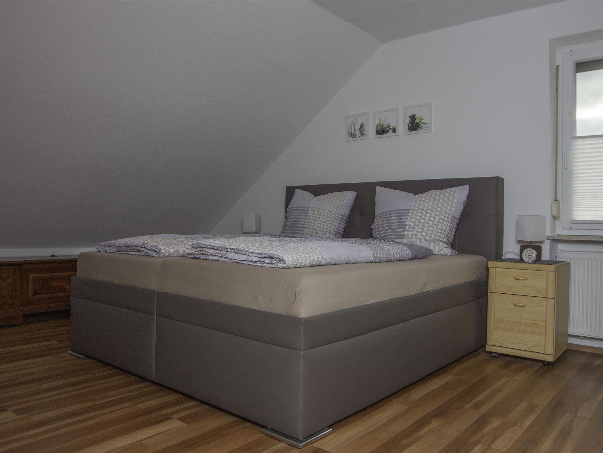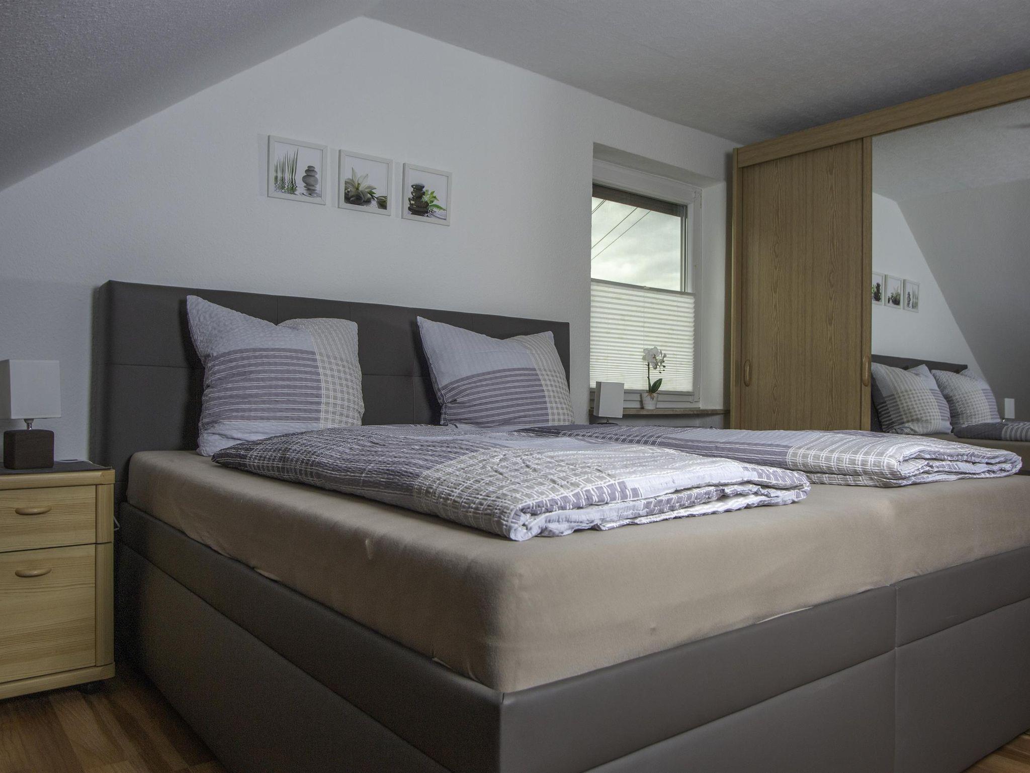 Die 3-ZKB-Wohnung befindet sich im 2. OG und verfügt über 90 m², welche Platz für 2-4 Personen bietet. Die 2 Schlafzimmer sind mit Boxspringbetten und geräumigen Kleiderschränken ausgestattet. Im Wohnzimmer befindet sich eine große Couch, welche sich zur Schlafcouch umwandeln lässt; hierauf kann eine Person zusätzlich Platz finden. Die Ferienwohnung hat einen Sat-TV-Anschluss sowie kostenfreies WLAN. Im Badezimmer mit Dusche/WC sind eine Waschmaschine sowie ein Trockner vorhanden. Föhn und Handtücher liegen für Sie bereit. Die voll ausgestattete Küche ist mit einem Kühl-/Gefrierschrank, Geschirrspüler, Mikrowelle, Wasserkocher, Senseo Kaffeemaschine und Toaster ausgestattet, somit bleiben keine Wünsche offen, um auch einmal selbst etwas Leckeres zu zaubern. Der kleine gemütliche Balkon lädt mit einer Sitzmöglichkeit zum Entspannen ein. Unsere Ferienwohnung bietet nicht nur Ruhe, sondern auch Abwechslung. Hier können Sie die Seele baumeln lassen.