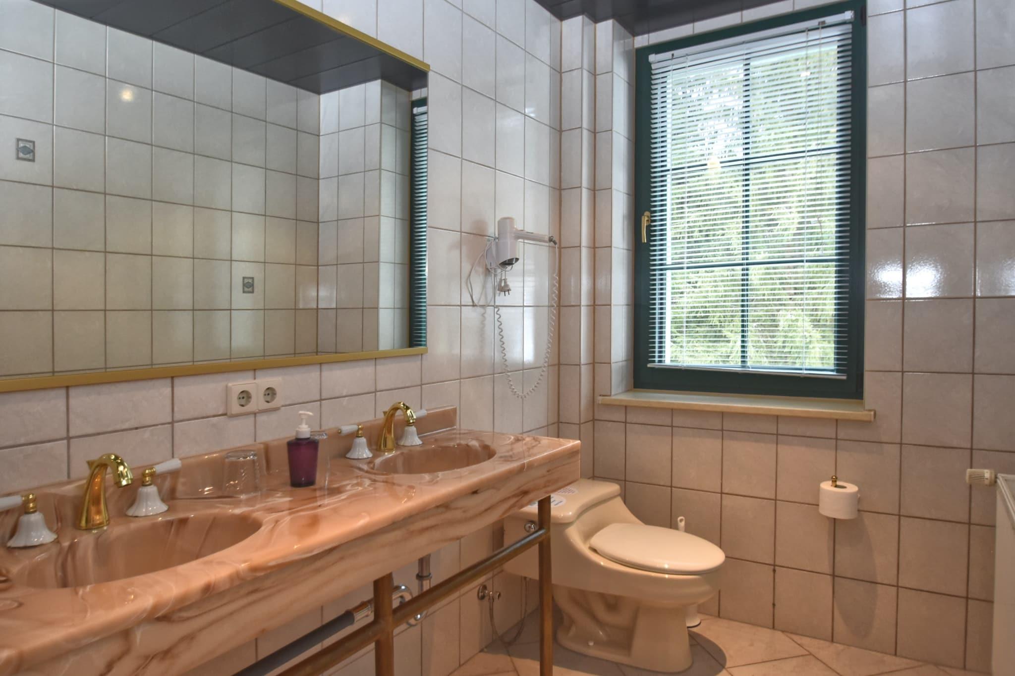 Ground floor: (Entrance, hall) On the 1st floor: (open kitchen(electric kettle, toaster, cooker(4 ring stoves, ceramic, electric), coffee machine(filter), oven, microwave, dishwasher, fridge(+ freezer)), Living/diningroom(TV(flatscreen, satellite), dining table(14 persons), seating area), bedroom(double bed(140 x 200 cm), TV(satellite)), Bedroom with bathroom(double bed(160 x 200 cm), TV(satellite), bath tub, washbasin, washbasin, toilet), Bedroom with bathroom(double bed(160 x 200 cm), TV(satellite), bath tub, washbasin, washbasin, toilet), Bedroom with bathroom(double bed(180 x 200 cm), TV(satellite), dining table, seating area, fridge, bath tub, washbasin, washbasin, toilet), Bedroom with bathroom(double bed(160 x 200 cm), TV(satellite), dining table, seating area, cooker(4 ring stoves, ceramic, electric), fridge-freezer, bath tub, washbasin, washbasin, toilet), bathroom(bath tub, washbasin, toilet, hairdryer), toilet(shower)) relaxation area(TV, shower, infrared sauna, sauna(paid, 4 persons), toilet), cot, hot tub(paid), balcony, heating(central), terrace(private, 100 m2), garden(shared with the the owner and other guests, 5000 m2), parking, trampoline, pond, deckchairs, swimming pool(shared with the the owner and other guests, outside, paid, heatable, roofed, 10 x 4 m., opened from May upto and including Sep), sand pit, play equipment, slide, table tennis table, party games, toys, insect screens, Sunscreen, Swing set