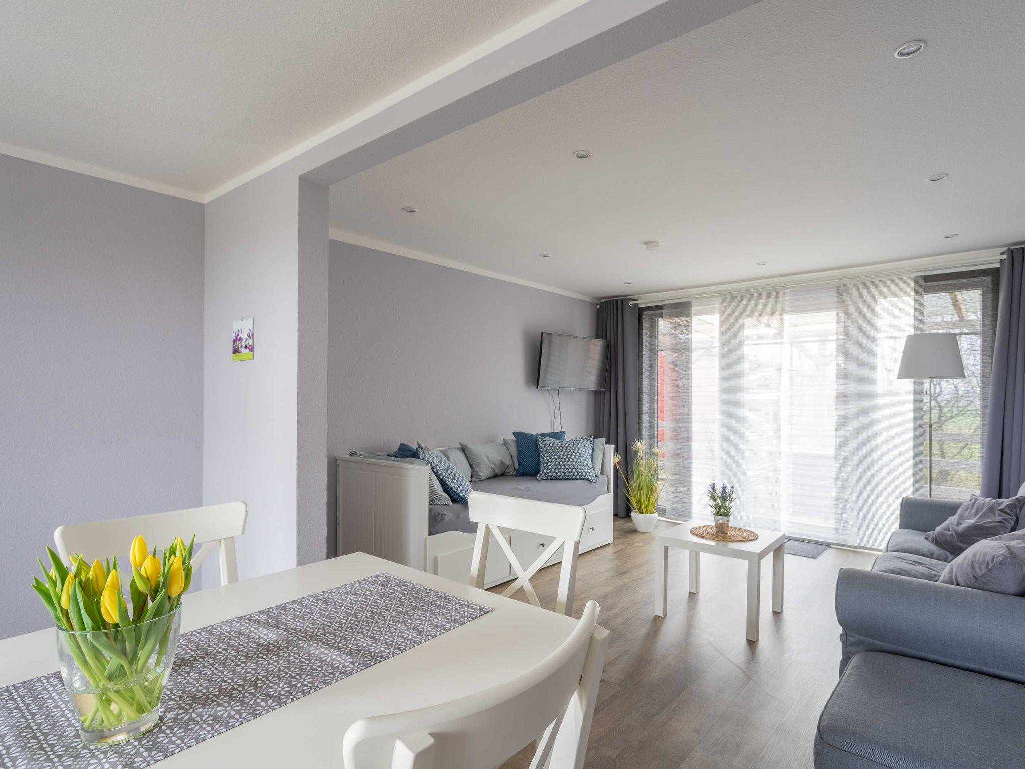 Ein Sofa im Wohnraum lässt sich auf ein oder zwei weitere Schlafplätze umbauen, so dass insgesamt sechs Personen übernachten können. In einem Doppelzimmer lässt sich bequem ein Kinderreisebett aufstellen.