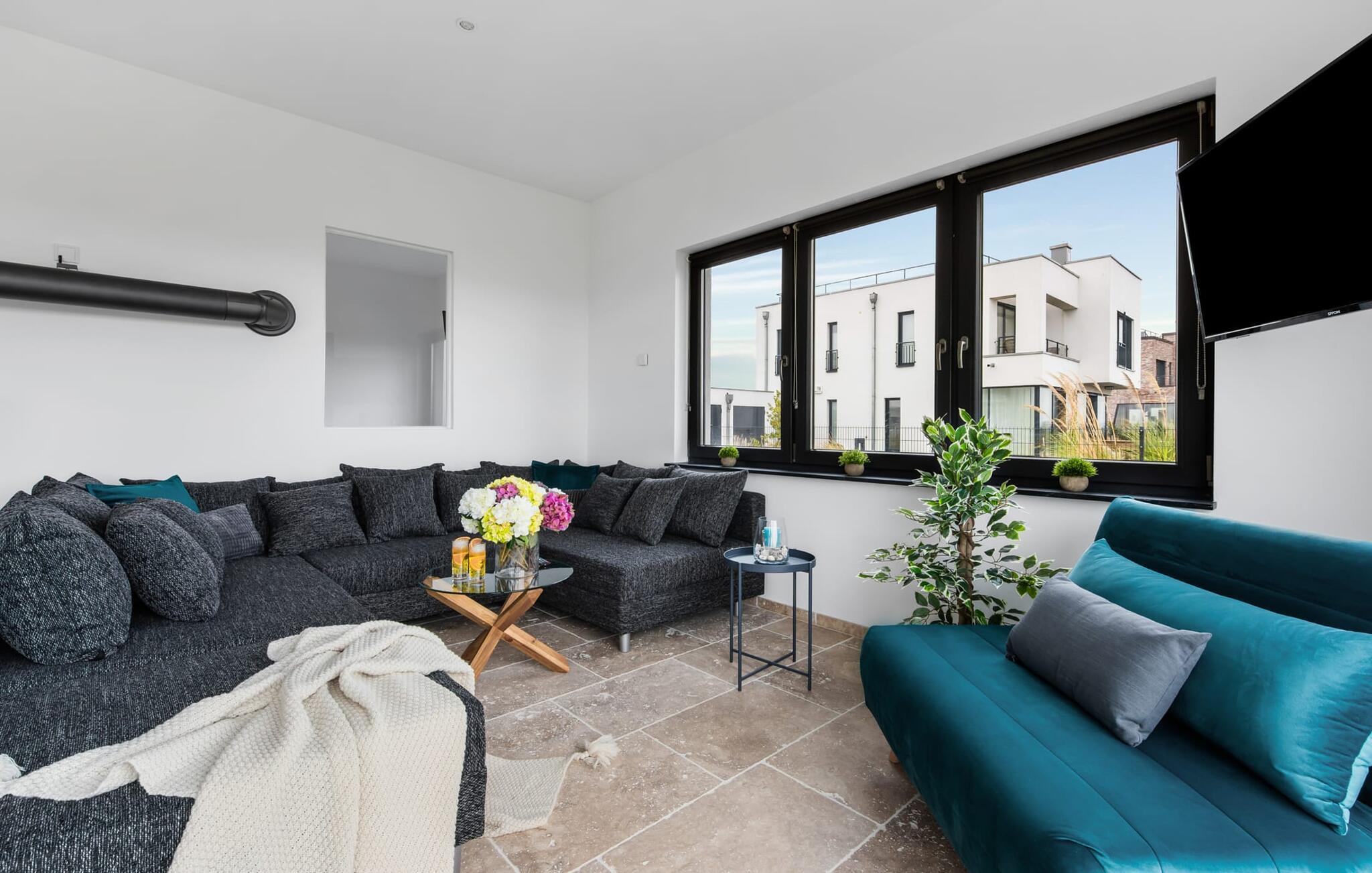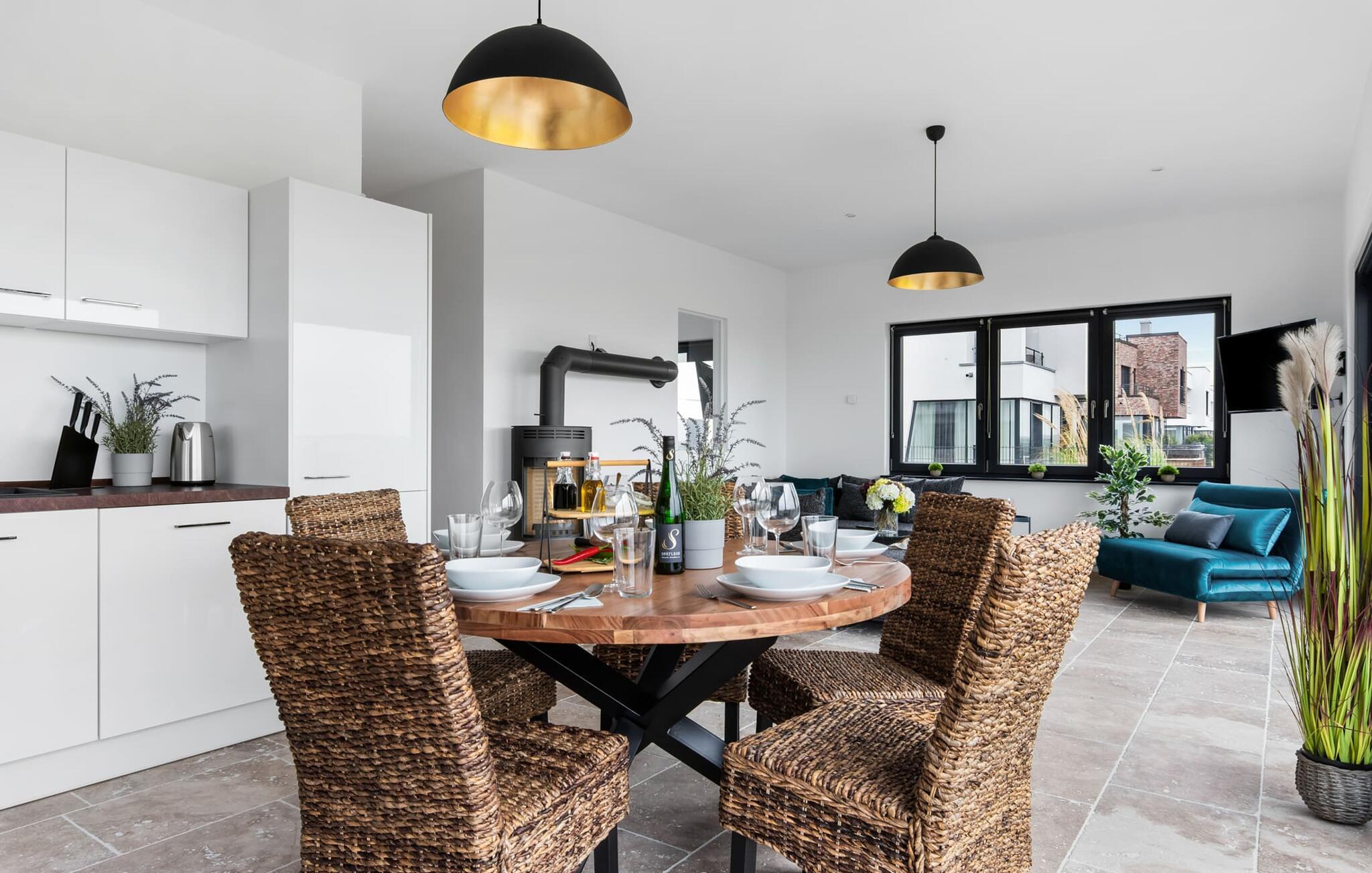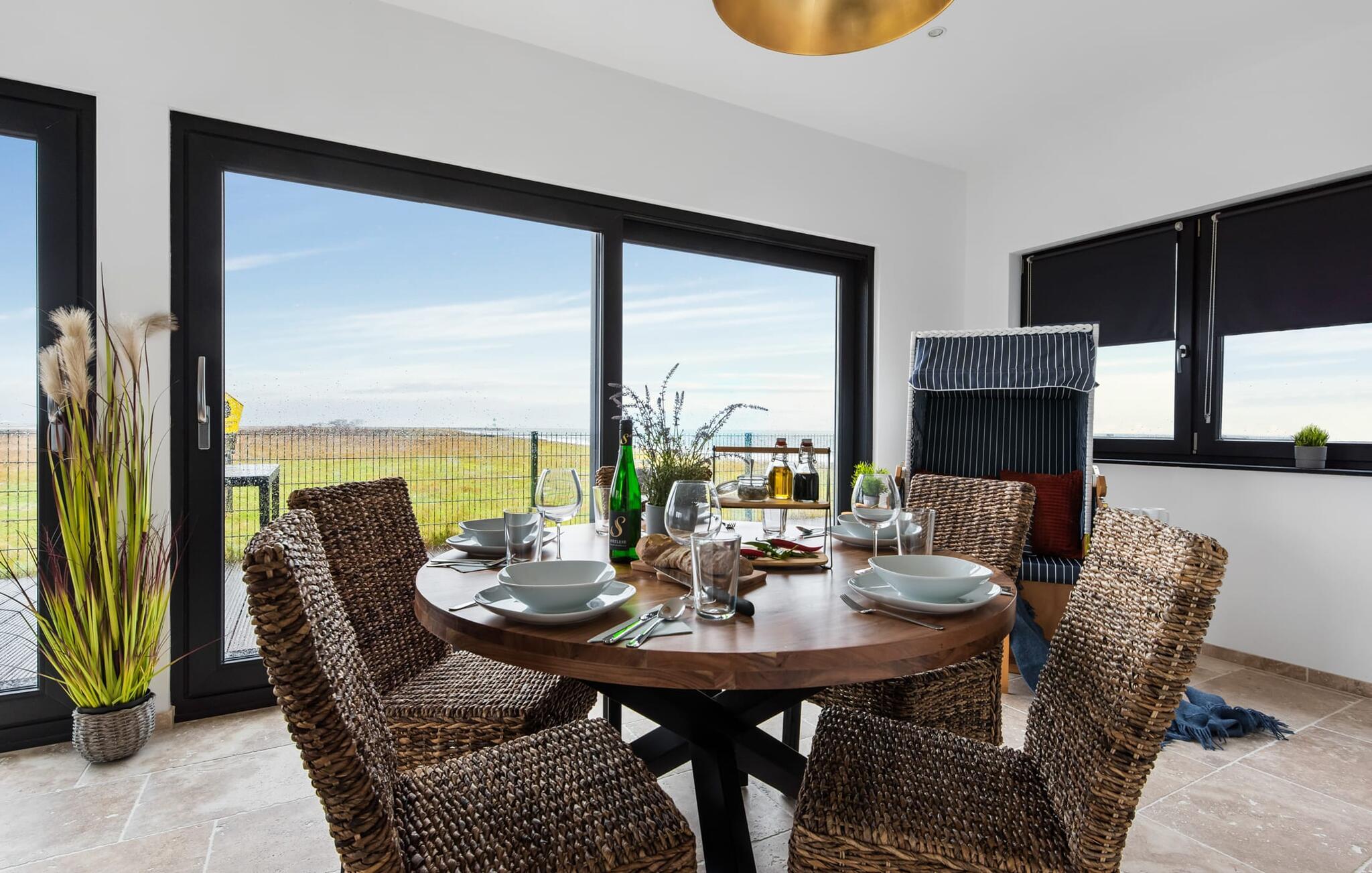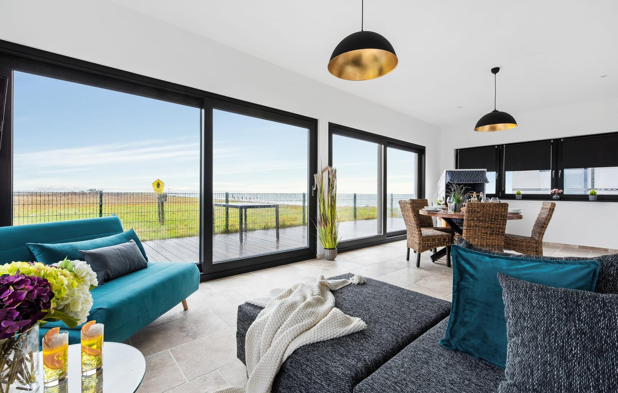 Der großzügige Wohn-/Essbereich mit angeschlossener, großzügiger Terrasse im Erdgeschoss bietet ausreichend Platz für bis zu fünf Personen. Naturstein Fußböden aus italienischem, hellen Travertin sorgen gemeinsam mit dem ökologischen Baukonzept aus Ziegelmauerwerk und Kalkputz für ein besonderes Raumklima und Gemütlichkeit. Dank bodentiefer Fenster ist die Ferienwohnung lichtdurchflutet. Die rundum ausgestattet Wohnküche von Bosch bietet alle Annehmlichkeiten. Offen gestaltet fällt sogar beim Kochen der Blick auf die Schlei und die Ostsee. Was will man Meer?