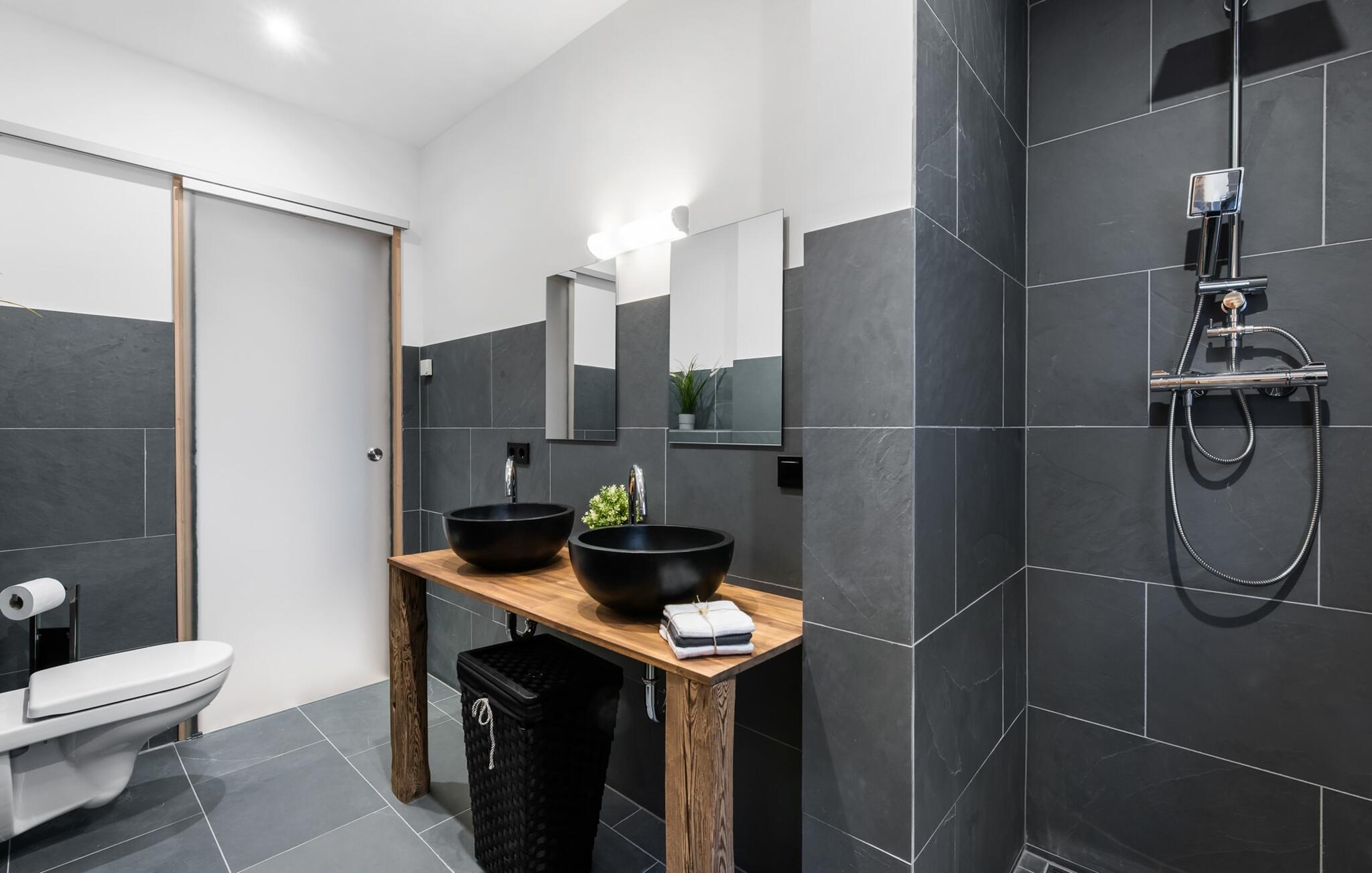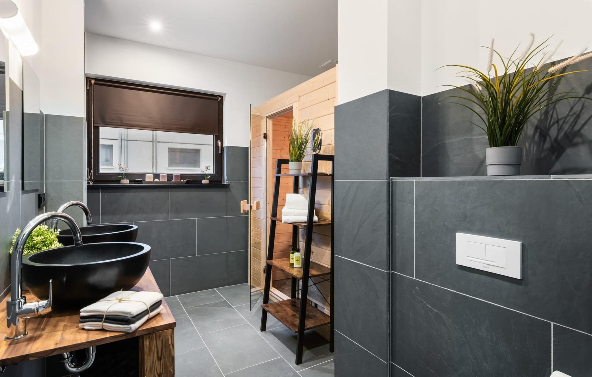 Das Naturstein-Duschbad aus brasilianischem Schiefer verfügt über eine finnische Sauna und eine große Regenschauerdusche. Hier lassen sich wahre SPA-Momente erleben! Für zusätzlichen Komfort sorgt ein Gäste WC.