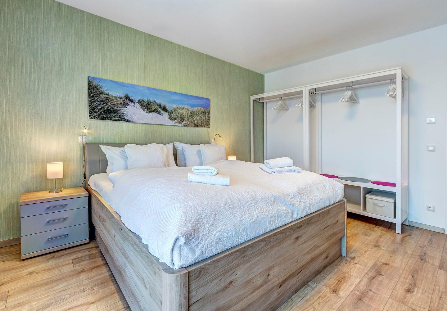 Das Schlafzimmer ist mit einem 180 x 200cm großem Doppelbett in Komforthöhe, Nachttischen, Leselampen, einer Kommode und offenen Kleiderschränken ausgestattet. Auch für das Aufstellen eines Kinderbettes ist ausreichend Platz vorhanden.