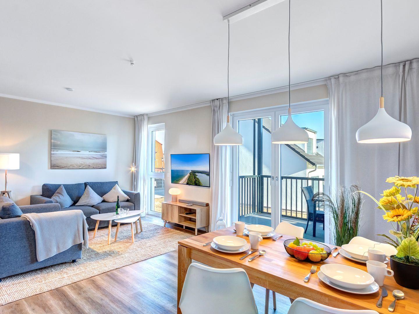Der lichtdurchflutete Wohn- und Essbereich öffnet sich zum Balkon mit Südost-Ausrichtung, Esstisch für vier Personen und gemütlichen Sitzgelegenheiten. Genießen Sie Ihr Frühstück oder entspannen Sie mit einem Glas Wein am Abend.