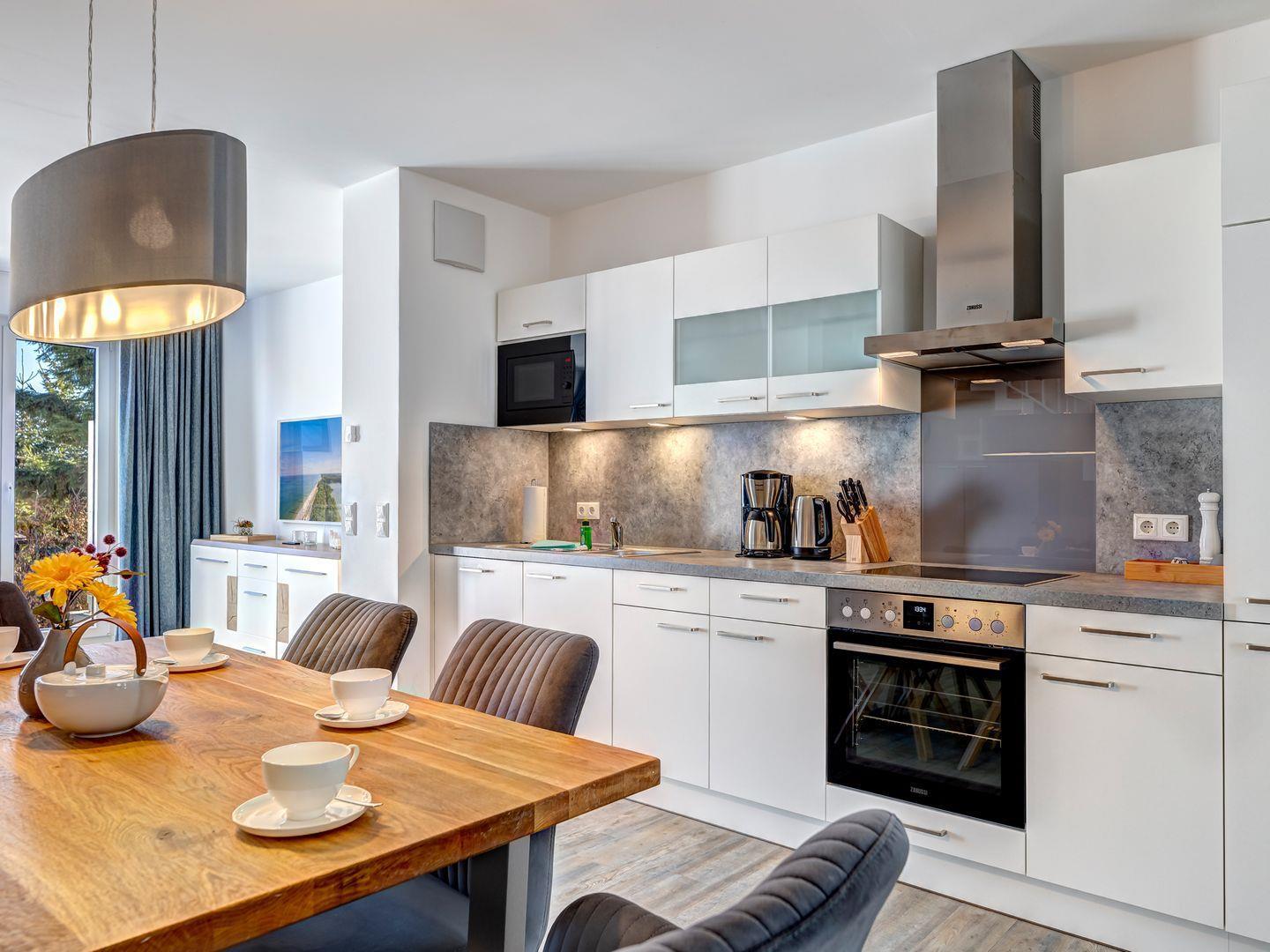 Sie betreten das Haus über einen gut ausgestatteten Eingangsbereich und gelangen in einen gemütlichen Wohn- Essbereich mit einer Einbauküche und einer einladenden Sitzecke mit 3- sitzigem Sofa und komfortablem Sessel sowie gepolsterten Hockern. An der Wand befindet sich ein großes Smart-TV (The Frame). In diesem großzügigen Raum ist genügend Platz zum gemeinsamen Kochen, entspanntem Essen, angeregter Unterhaltung und Erholung mit Blick aus den bodentiefen Fenstern ins Grüne. Eine möblierte Terrasse mit Garten lädt an warmen Tagen zum Frühstück oder am Abend zum entspannten Glas Wein ein.