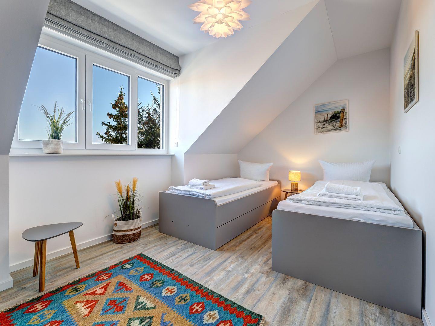 Im kleineren Schlafzimmer stehen zwei Einzelbetten mit 7-Zonen-Taschenfederkernmatrazen. Die Betten können bei Bedarf aneinander geschoben werden. Ein Schrank mit Schwebetüren und Spiegel — ebenfalls im Stil „Bornholm“- bietet ausreichend Platz für alle persönlichen Gegenstände.