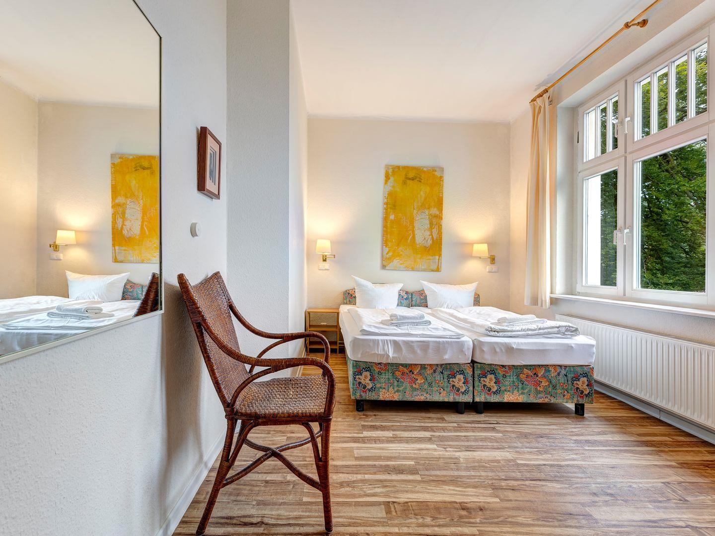 - das helle Schlafzimmer ist mit zwei nebeneinander stehenden Einzelbetten ausgestattet, die durch ein gemeinsames Kopfteil verbunden sind