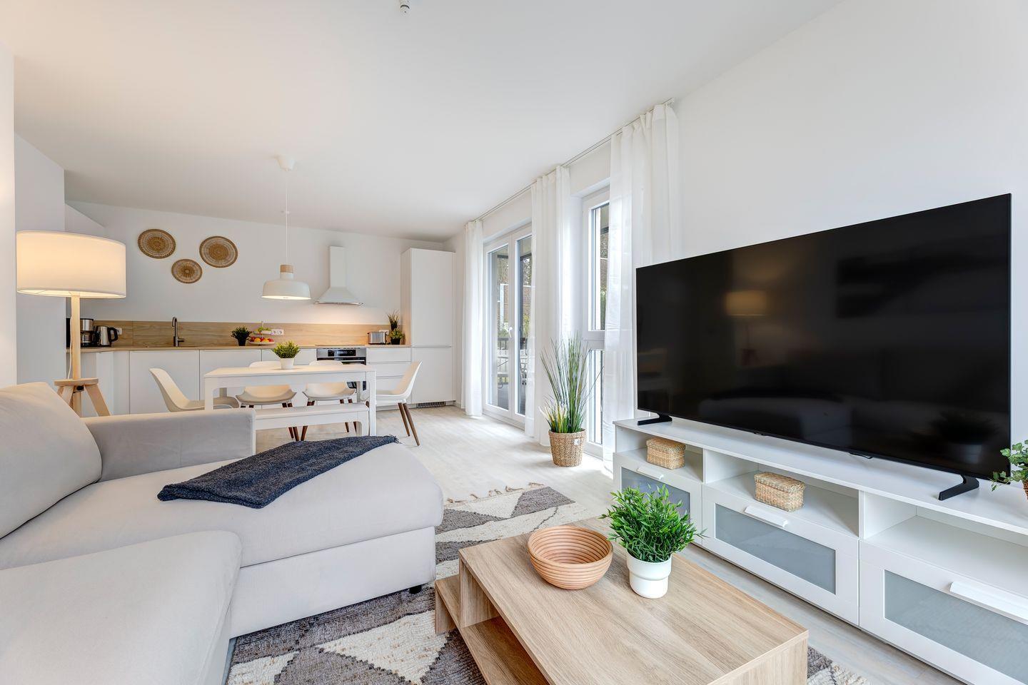 Das stilvoll eingerichtete Wohnzimmer mit angrenzender Küche bietet ausreichend Platz, um gemeinsame Stunden mit Familie oder Freunden zu verbringen – sei es nach einem erlebnisreichen Tag am Strand oder einer spannenden Erkundungstour über die Insel. Die moderne Küche ist mit hochwertigen Geräten ausgestattet und lädt zu geselligen Kochabenden ein.