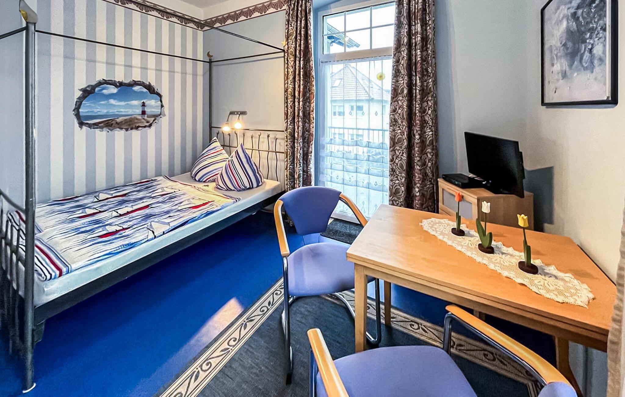 Die kleine Einraum-Wohnung für 2 Personen befindet sich im Obergeschoss und verfügt über einen möblierten Balkon. Sie ist ausgestattet mit einem kombinierten Wohn-/Schlafraum mit offener Küchenzeile (Doppelbett, Sitz- und Essecke, Flachbild-TV, E-Kochfeld, Kühlschrank mit Tiefkühlteil, Mikrowelle, div. Küchengeräte), sowie einem Bad mit DU/WC.