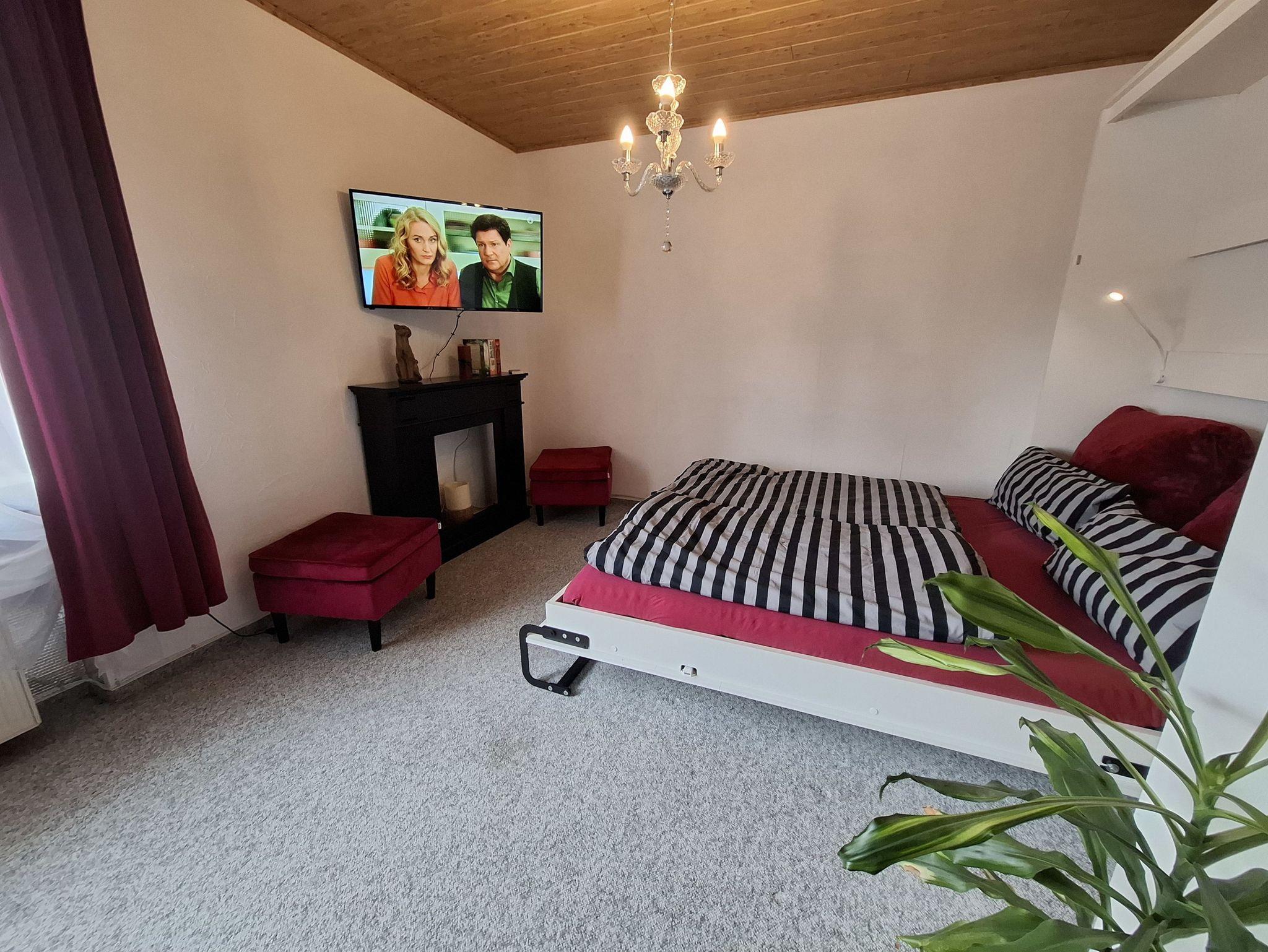 Im Schlafzimmer befindet sich ein Doppelbett (1,80 x 2,00 m) mit Fußende, zwei „Kleiderstühle“ und eine Kommode. Eine zusätzliche Baby-Aufbettung wäre auf Anfrage möglich.