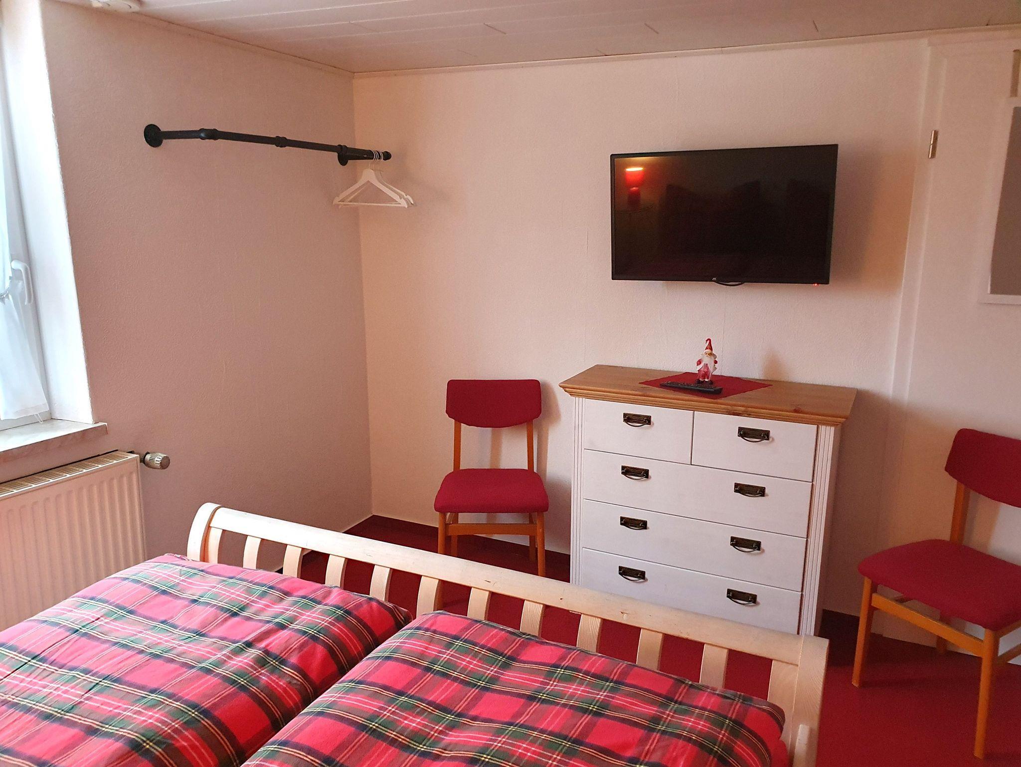 Zur Ausstattung gehören eine kleine Küche mit einem Tisch und vier Stühlen, ein 2-Platten-Ceranfeld und einem kleinen separaten Backofen, sowie zwei Schlafzimmer. Diese bieten Platz für 1 - 4 Personen. In den Schlafzimmern befinden sich jeweils ein Doppelbett (1,80 x 2,00 m) mit Fußende, eine Kleiderstange, eine Kommode und zwei Stühle, sowie ein Flat-TV an der Wand. Zusätzliche Kissen zur Auswahl bieten Ihnen einen besonderen Schlafkomfort.