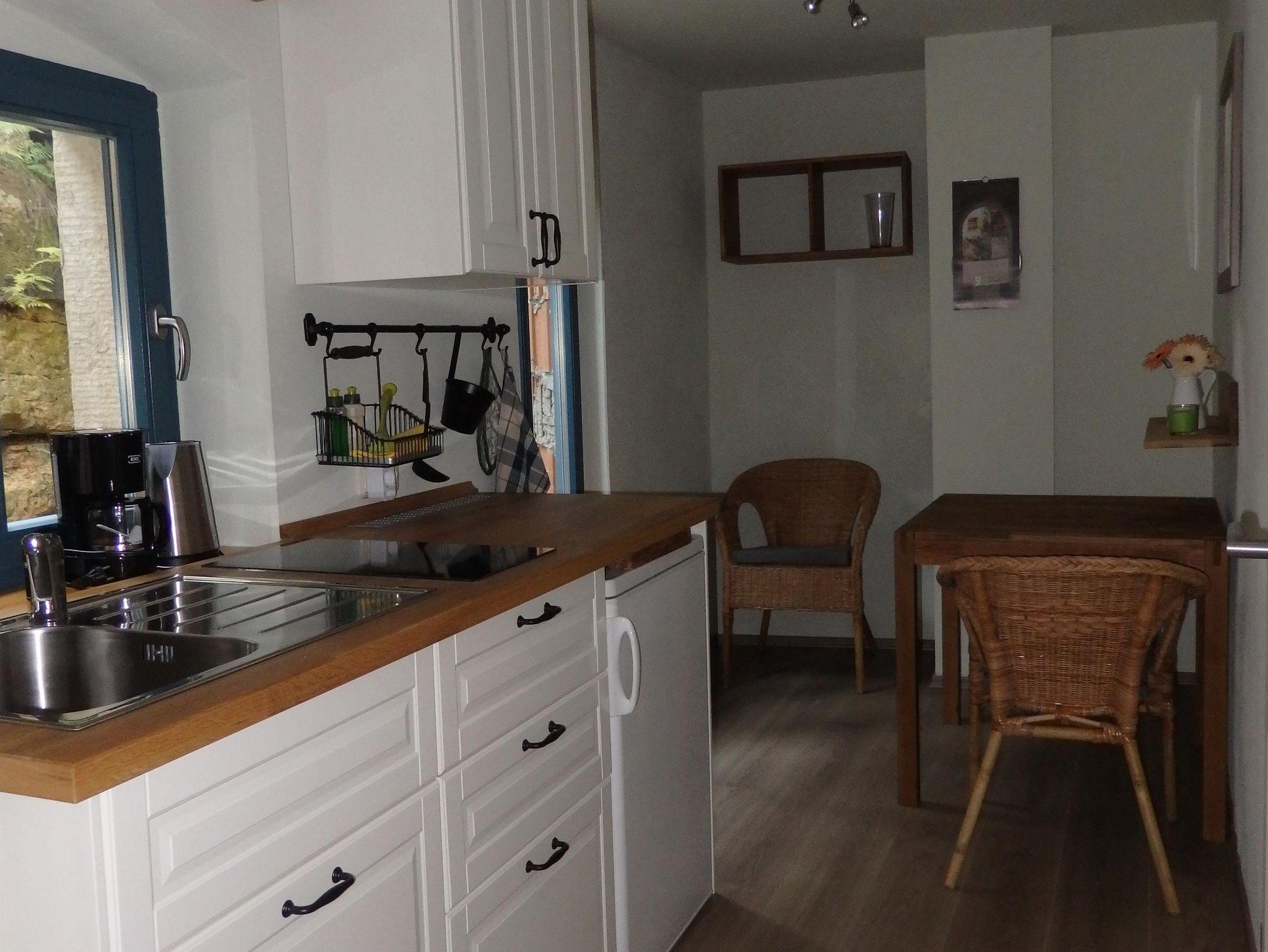 Die kleine Ferienwohnung in der ersten Etage hat eine Wohnküche mit Küchenzeile und Essplatz, ein Schlafzimmer mit Doppelbett, ein Duschbad und eine Garderobe.