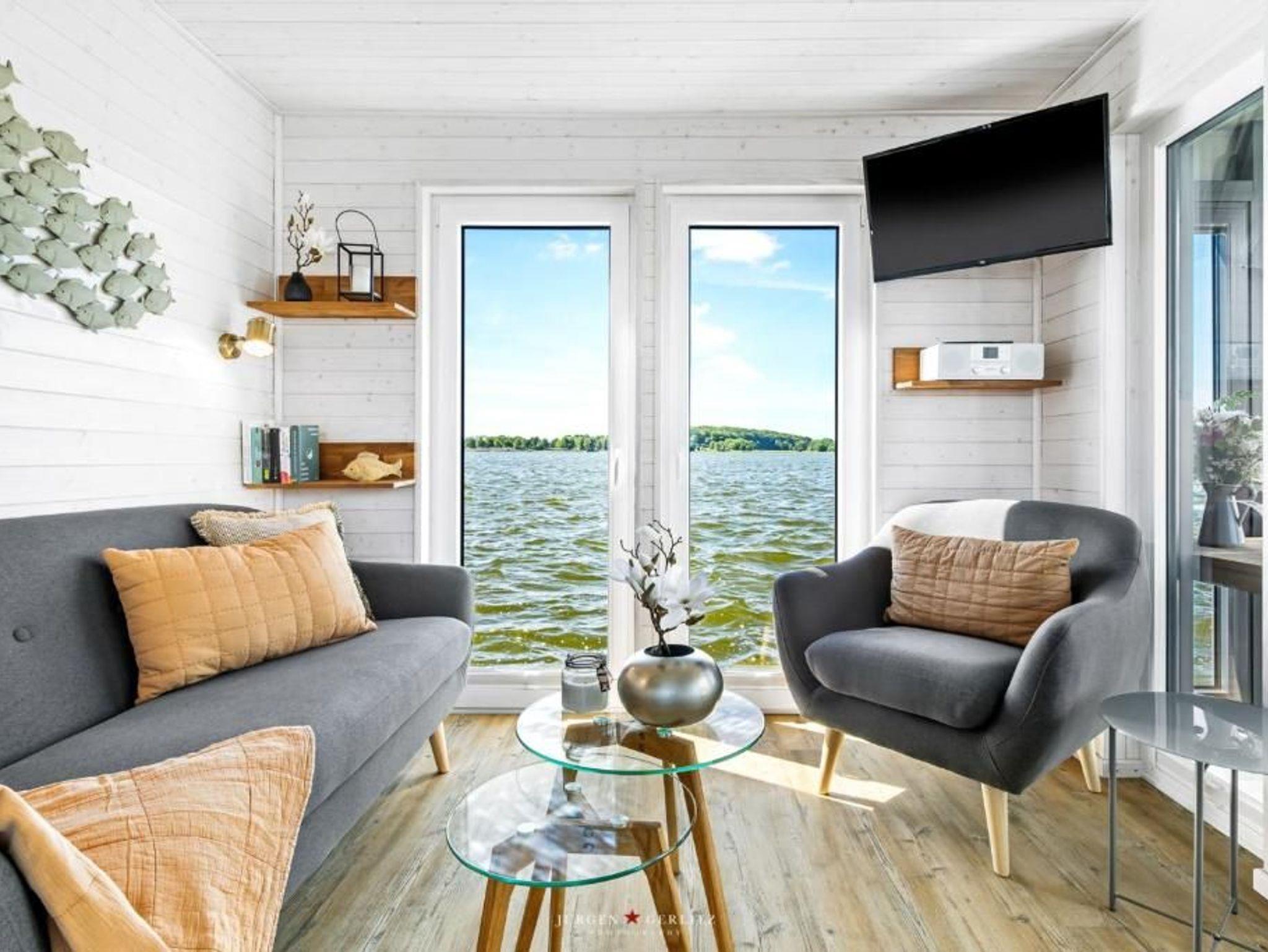 Dieses geräumige festliegende Hausboot bietet Ihnen auf 40 qm Bootsfläche den ganzen Komfort einer modernen und hochwertigen Ferienwohnung mit Sonnen- und Dachterrasse. Im gemütlichen lichtdurchfluteten Wohnraum mit offener Küche lässt es sich entspannt auf der Couch und im Sessel verweilen oder Sie kommen am großzügigen Tisch zu einem leckeren Essen oder Spieleabend zusammen.