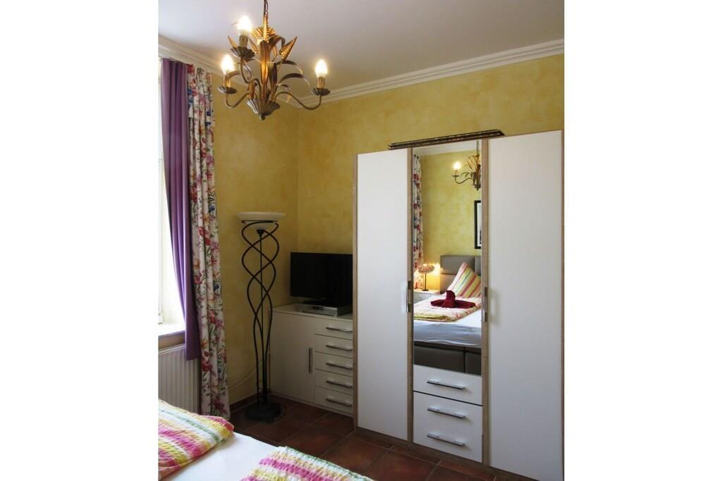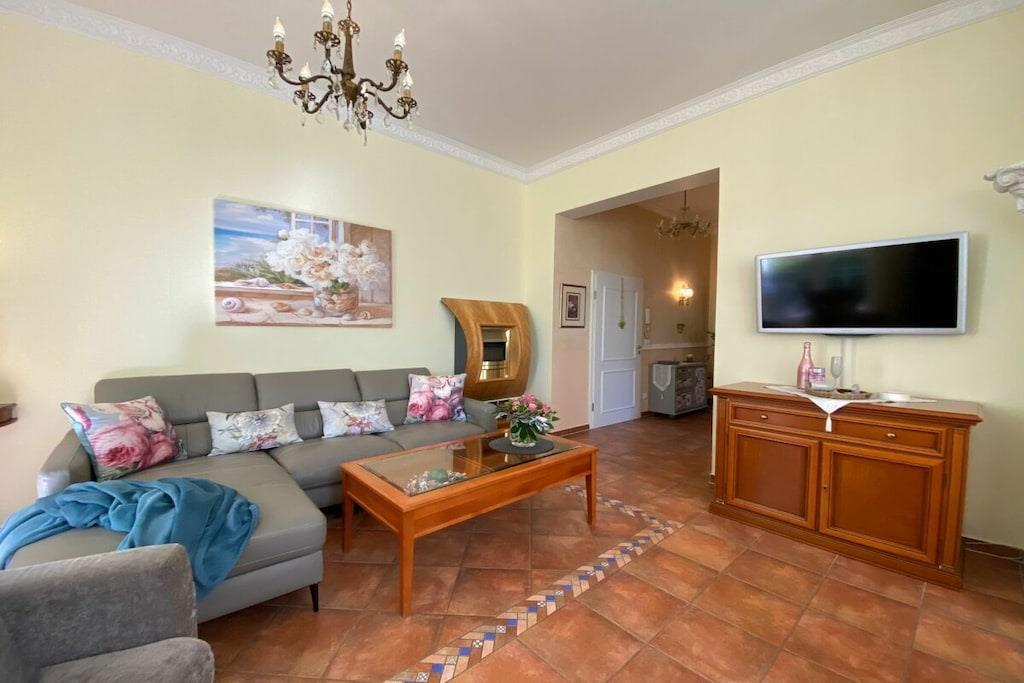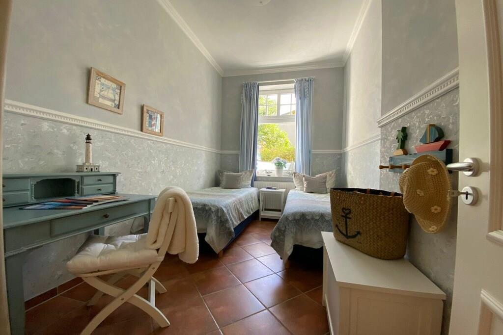 Wir setzen strenge Hygienemaßnahmen in Zeiten von Corona nach geltenden Schutz- und Hygienestandards bei der Endreinigung um. Bei können Sie sich sicher fühlen. Eine frisch in 2023 renovierte Wohlfühlfewo mit Altbau Charme, schönen Stuckdecken & modernster Technik freut sich auf Ihren Aufenthalt! Großzügige 3 Zi.-Wohnung im Hochpaterre mit sonn. WZ, bequem möbliert mit gemütlicher Couchgarnitur, Kamin, Fachbild-TV, Musikanl. superschnellem Wlan Internetzugang - gr. mediterrane Eßgruppe & off. Countryküche mit Kochinsel & edlen Granitarbeitsflächen sowie Vollausstattung! Zur WZ Südseite liegt 12 m² gr. Loggia mit mod. Sitz-/Eßmöbeln an & XL-Strandkorb! SZ I - sonnengelbes Doppel-SZ im Laura Ashley Stil sep. TV, Kommode, Kleiderschr. SZ II - maritimes Raumkonzept mit 2 Einzelbetten, Schreibtisch und Kleiderschrank. Vollbad mediterran mit Fenster, sep. Dusche, Rundeckbadewanne, Waschtisch, WC, Drehschrank, 2 gr. Spiegel;