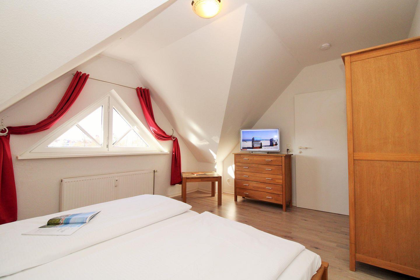 Das gemütliche 1. Schlafzimmer ist mit einem bequemen Doppelbett, Nachttischen, einem Kleiderschrank, einer Wäschekommode sowie einem kleinen Tisch eingerichtet. Darüber hinaus steht Ihnen auch hier ein TV-Gerät zur Verfügung.