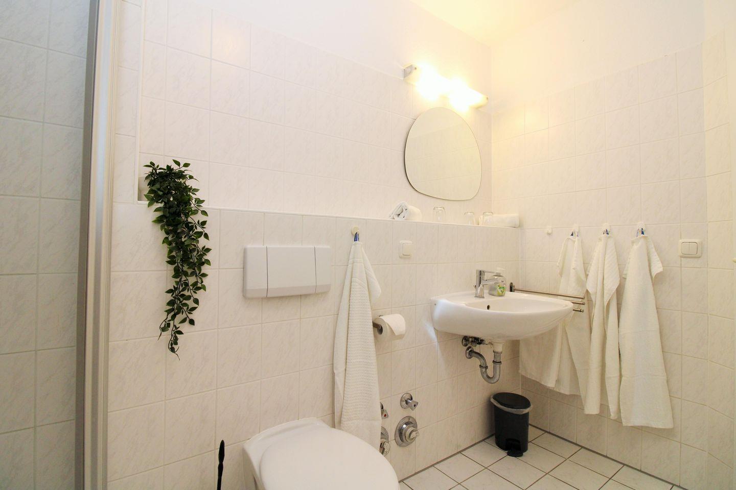 Das Badezimmer verfügt über eine Dusche, Waschbecken und WC sowie ausreichend Ablagemöglichkeiten.