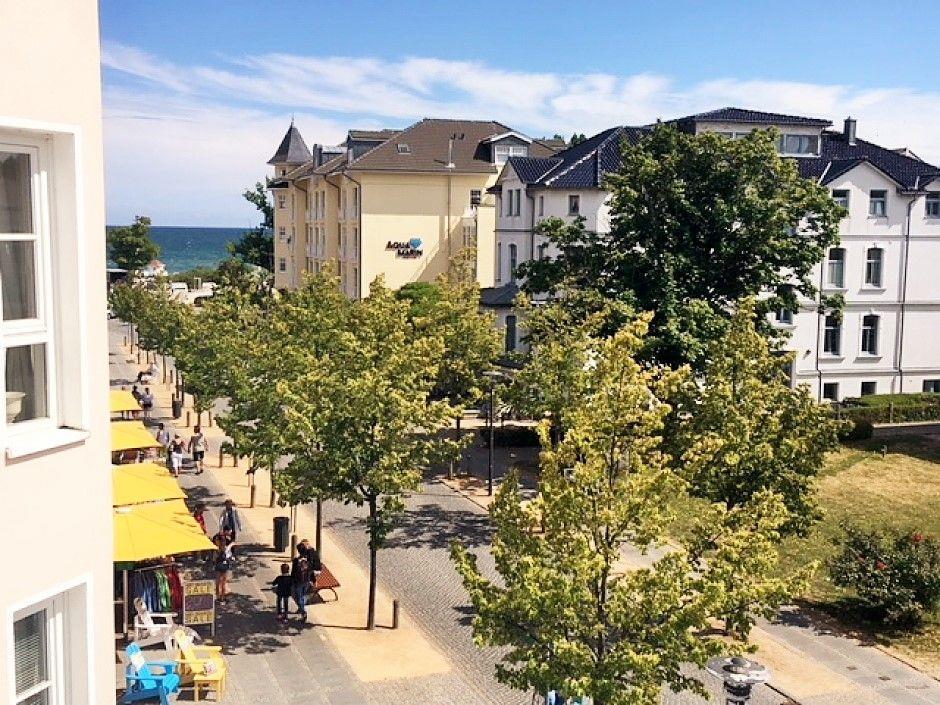 Das helle und geräumige Wohn-/Esszimmer verfügt über eine bequeme Couch, Sessel und Couchtisch, einen separaten Esstisch mit 4 Stühlen sowie ein Sideboard. Von hier aus haben Sie direkten Zugang zu dem ca. 12 m² großen und sonnigen Balkon (nach Osten / Südosten ausgerichtet) mit Balkonmöbeln - hier sitzen Sie entspannt und können den herrlichen seitlichen Blick auf die Ostsee sowie das muntere Treiben auf der Hermannstraße genießen.