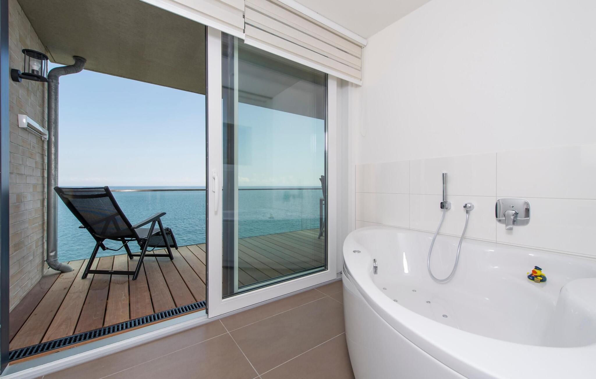 Das voll ausgestattete Badezimmer lässt Wellness-Herzen höher schlagen, denn neben finnischer Sauna und ebenerdiger Dusche überzeugt dieses mit einer Whirlpool-Badewanne und direktem Ostseeblick. Zudem verfügt die Wohnung über ein Gäste WC.
