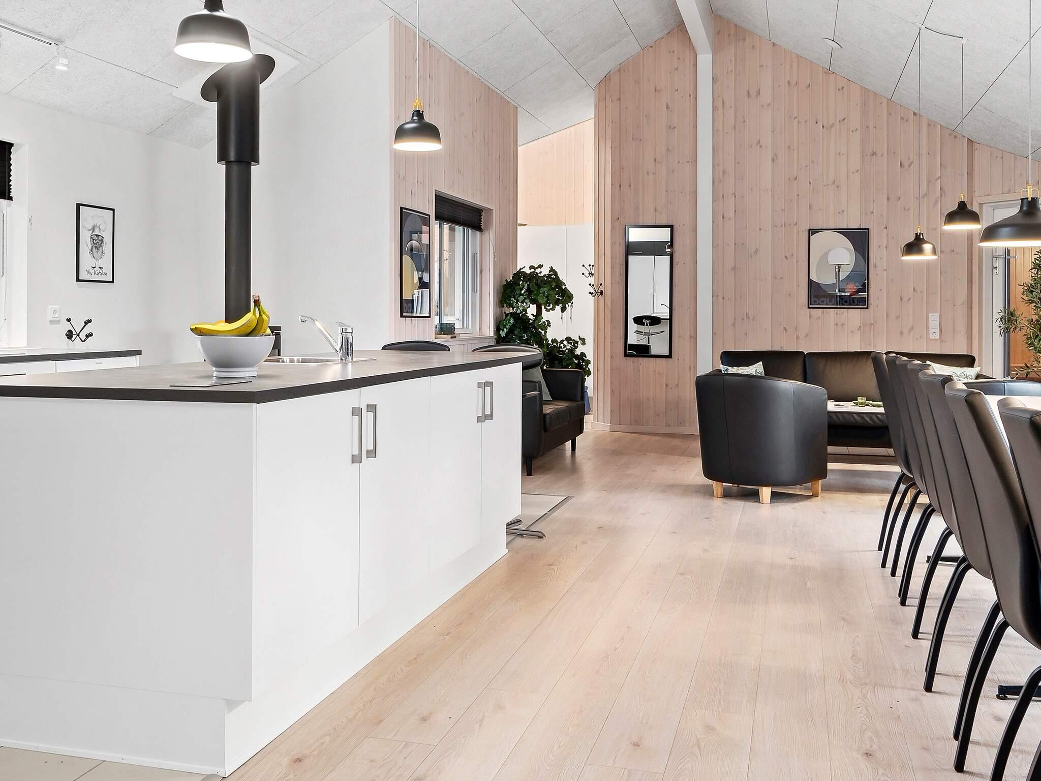 Mitten im Haus befindet sich eine große Wohnküche mit langem Esstisch