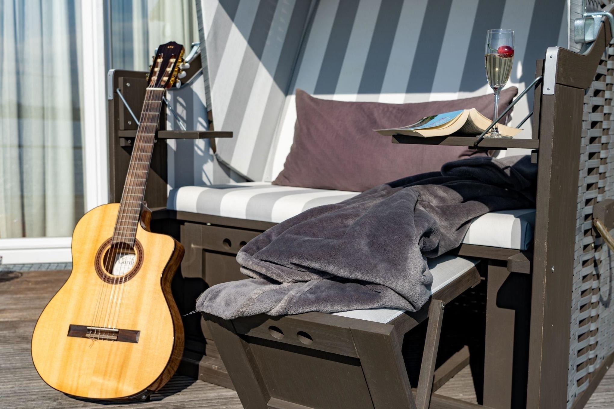 Die Terrasse mit Hafenblick und einem Strandkorb lädt zum Entspannen ein.