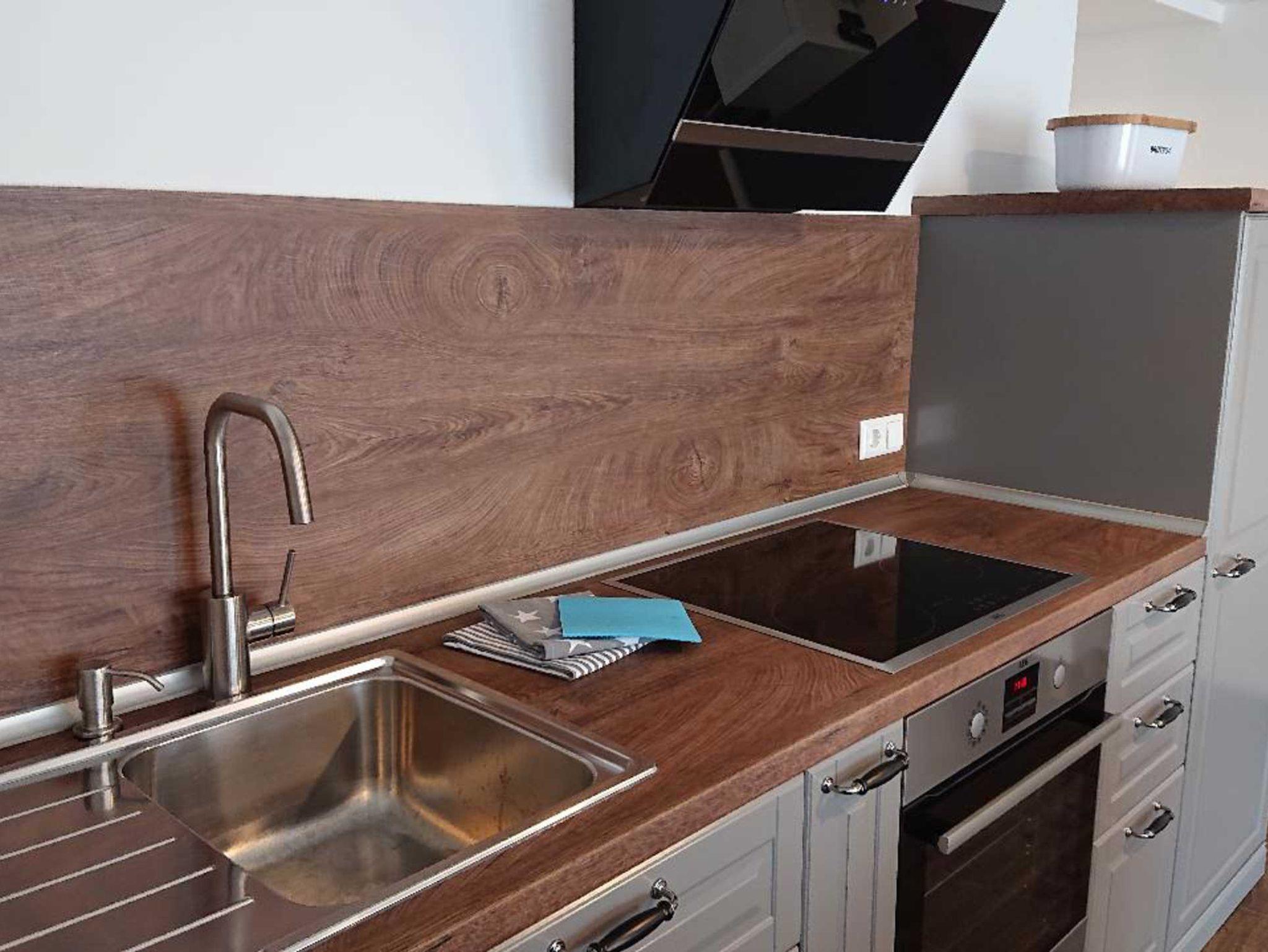 Die Wohnküche ist vollständig eingerichtet und bietet unter anderem einen Kühlschrank mit Gefrierfach, Backofen, Induktionskochfeld, Spülmaschine, Kaffeemaschine, Toaster und Wasserkocher. Ein Esstisch mit vier Sitzplätzen, ein internetfähiger TV sowie eine bluetoothfähige Stereoanlage stehen ebenfalls zur Verfügung.