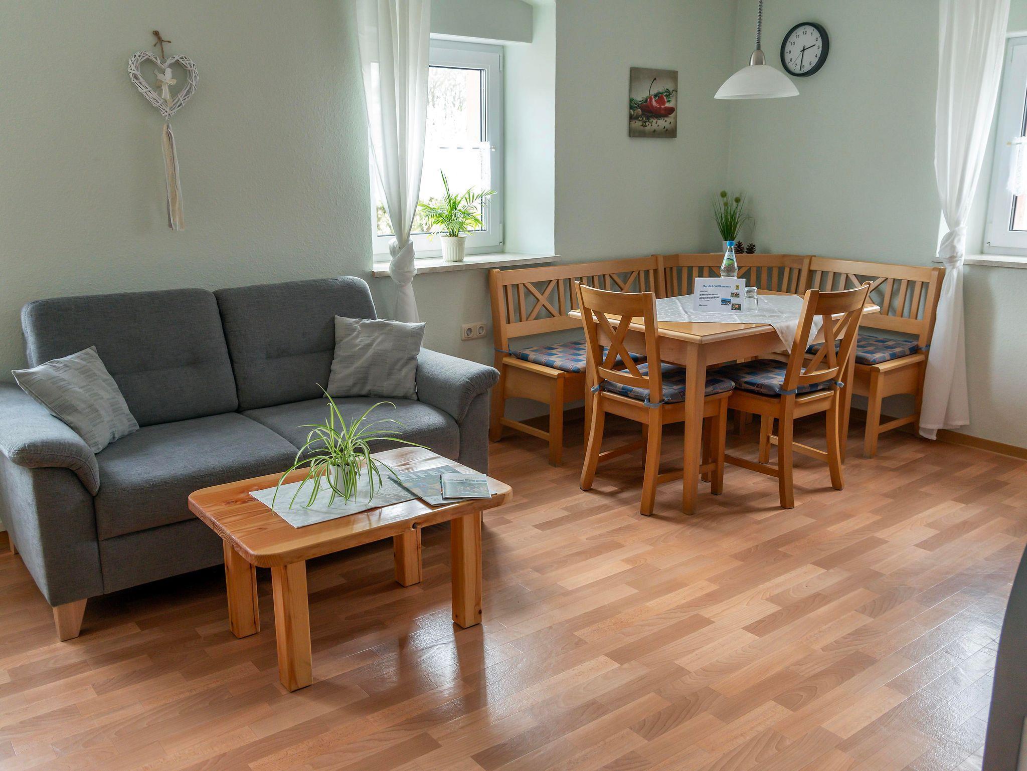 Unsere liebevoll eingerichtete Ferienwohnung „Spatzennest“ ist 60qm groß und bietet bis zu 3 Erwachsene und 1 Kleinkind Platz. Die Wohnung befindet sich in der ersten Etage und ist über eine Außentreppe mit kleinem Balkon und separatem Eingang erreichbar. In der Wohnung finden Sie eine Wohnküche mit Essecke und komplett ausgestatteter Küche, ein Bad mit Dusche und WC, ein Schafzimmer mit Doppelbett und ein Schlafzimmer mit Einzelbett und Kinderbett, ein Abstellraum mit Staubsauger und Putzutensilien, Wickeltisch und Hochstuhl, Kaminofen für gemütliche Abende, sowie Sat–TV und CD–Player vor.