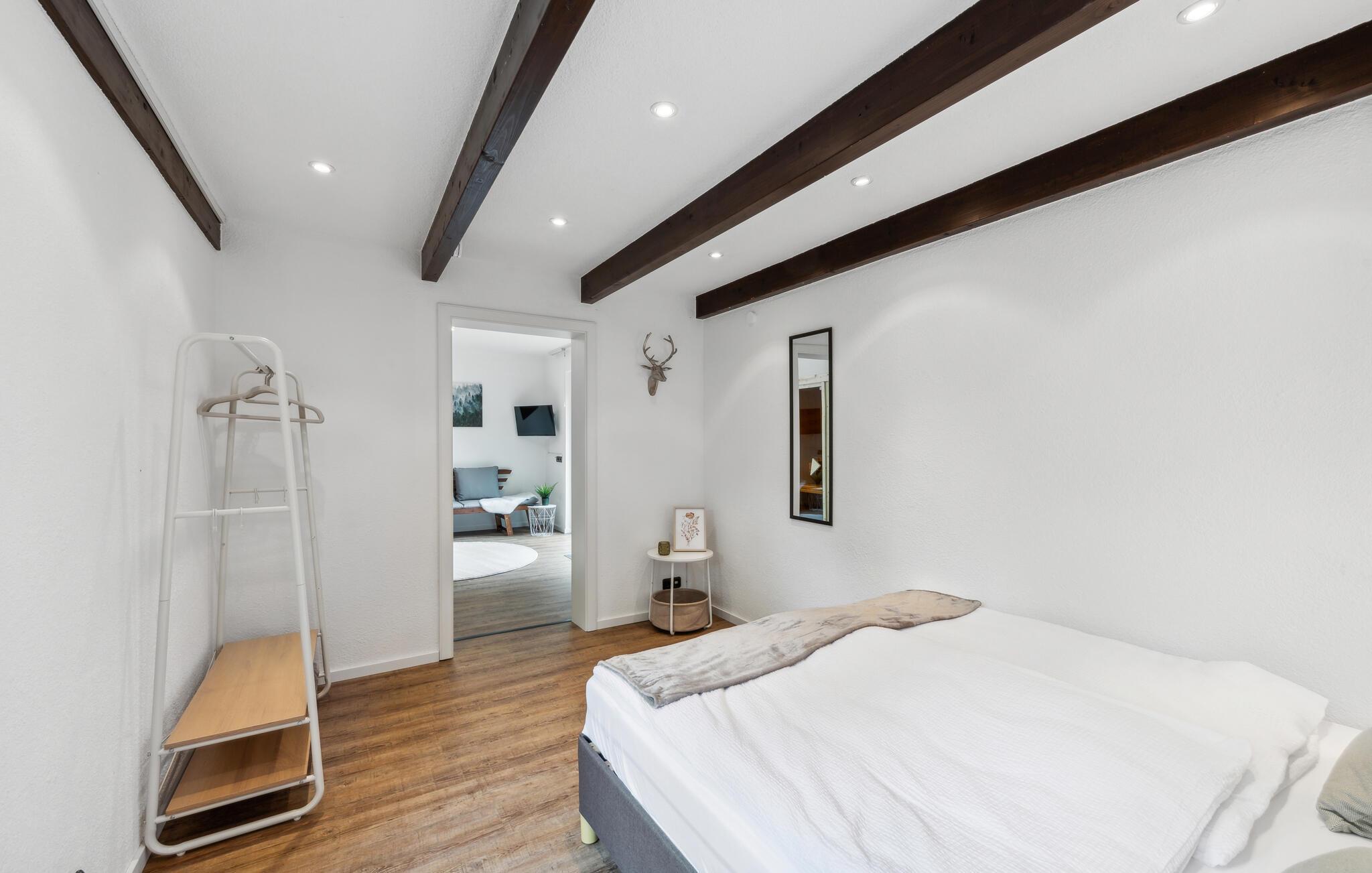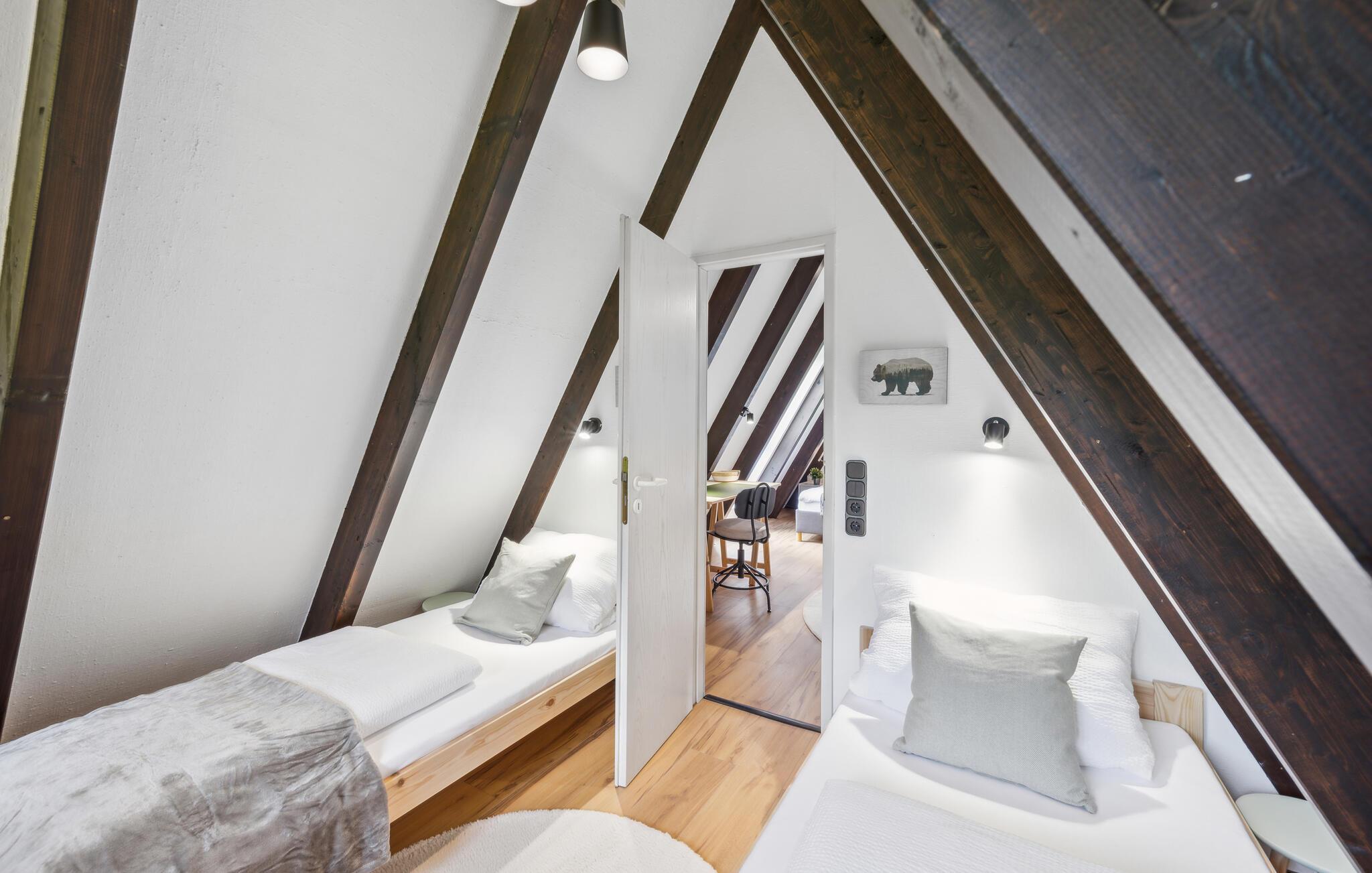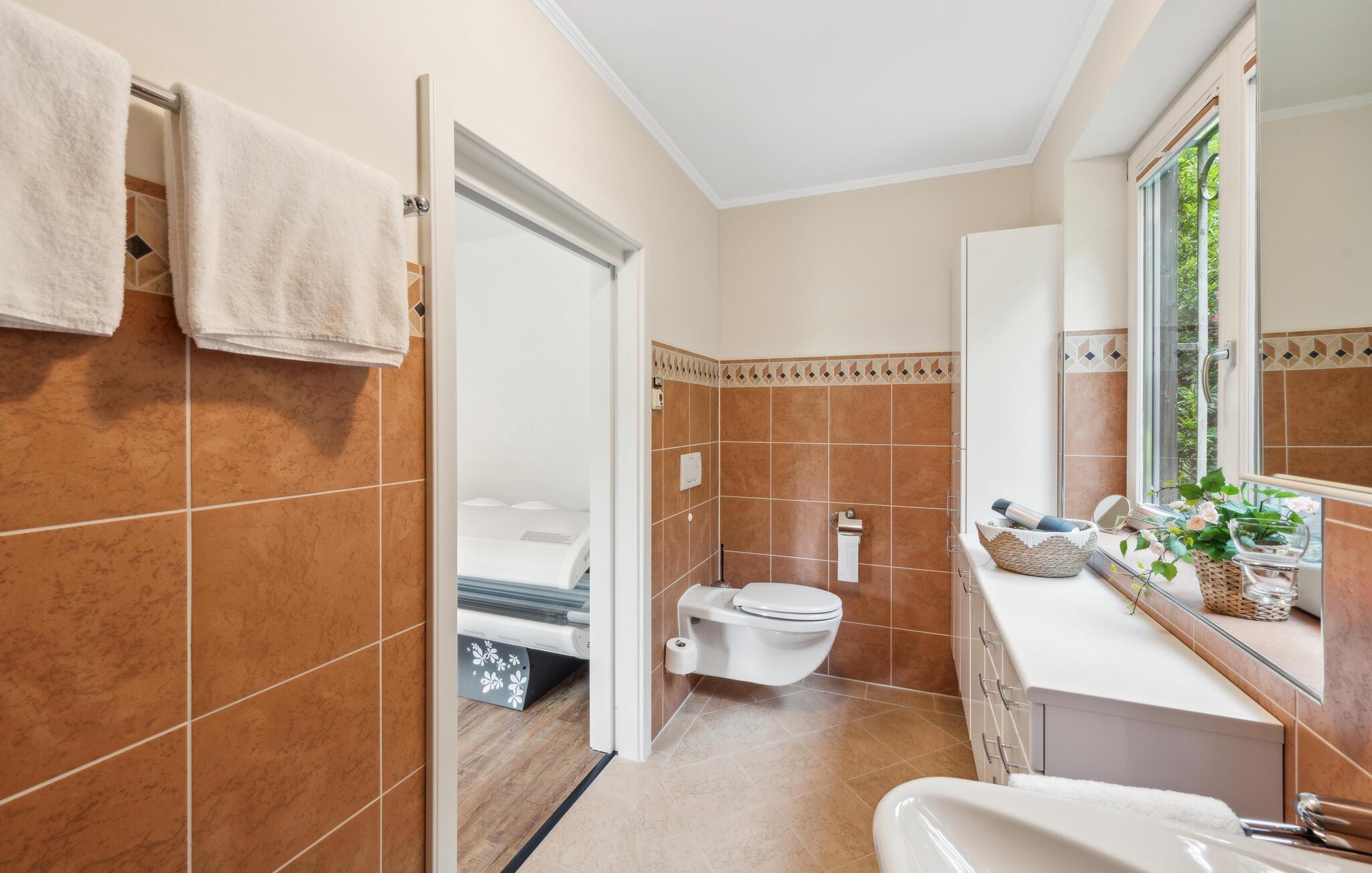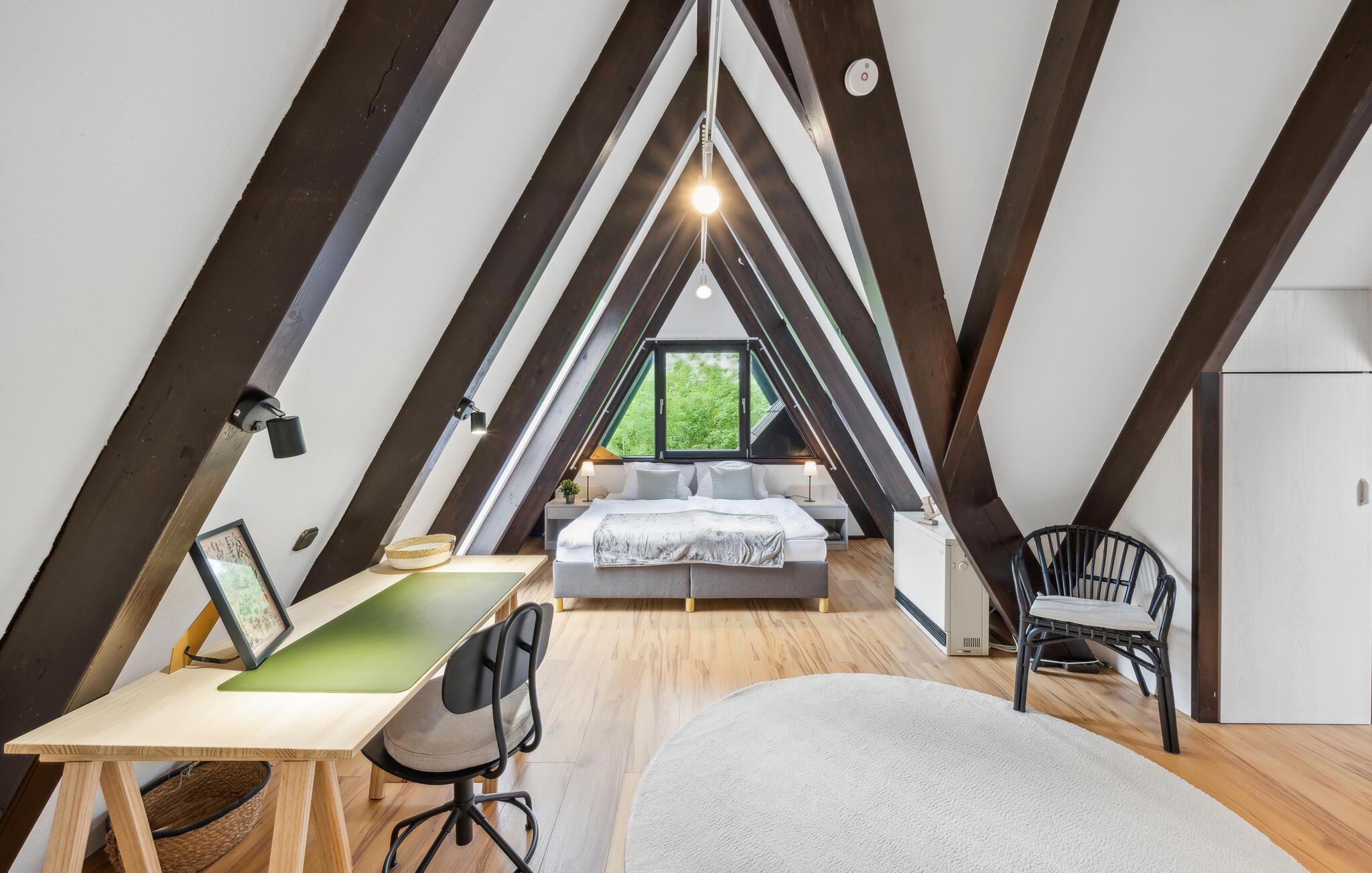 Lassen Sie den Alltagsstress hinter sich und tanken Sie neue Energie in dieser idyllischen Umgebung. Bei Ihrer Anreise werden Sie gleich die spannende Architektur Ihres Ferienhauses und den liebevoll gestalteten Garten bemerken. Freuen Sie sich auch auf ein gemütliches Frühstück auf der Terrasse und auf die attraktive Innengestaltung. Der Wohnbereich des Hauses ist geräumig und gemütlich zugleich. Machen Sie es sich auf dem großen Sofa bequem und genießen Sie die sichtbaren Holzbalken, die geschmackvolle Einrichtung und den Blick durch die großen Fenster ins Freie. Auch an Aktivitäten fehlt es hier nicht. Spielen Sie Tischfußball oder Dart. Und nutzen Sie auch Ihre Wellnesseinrichtungen. Die Sauna und das Solarium erwarten Sie zu entspannten Stunden.