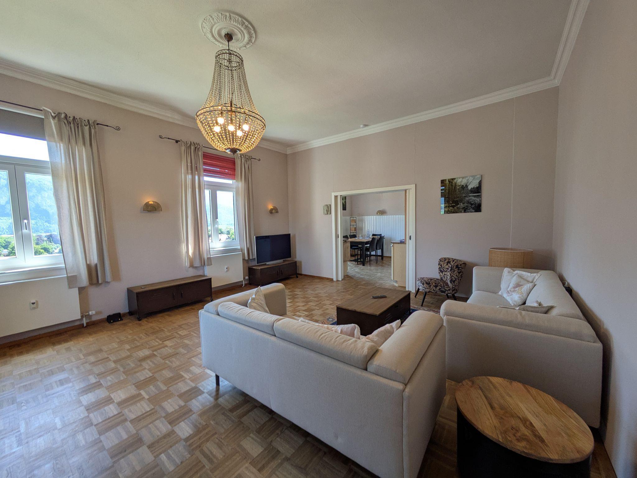 Repräsentatives Anwesen aus dem Baujahr 1903 in exponierter Lage über den Dächern von Kiefersfelden mir freiem Blick auf das Inntal und die Festung Kufstein, direkt am Fuß des Buchberg's gelegen. Die Wohnung liegt im 1. Stock und ist aus ursprünglich 2 Wohnungen zusammengefügt. Sie hat daher 2 Schlafzimmer in jeweils abgetrennten Bereichen mit zugehörigem hochwertigem Badezimmer - eines mit Waschmaschine, Dusche und WC und das andere mit holzverkleideter Badewanne und WC. Die Raumhöhe beträgt bis zu 3,30 m mit stuckverzierter Decke. Ein großes Wohnzimmer mit freiem WLAN-Zugang. Eine exklusiv vollausgestattete Wohnküche mit Terrassenzugang und einem Esstisch für 6 Personen. Ein besonderes Highlight ist die 20 qm große Terrasse mit freiem Blick ins Inntal und die umliegenden Berge. Die Wohnung ist am besten geeignet für 4 Personen, welche auf eine exklusive Wohnumgebung und gehobene Wohnqualität mit hochwertiger Ausstattung Wert legen. Aufgrund der Hanglage der Immobilie ist sie für gehbehinderte Menschen eher nicht geeignet. Die Anfahrt erfolgt über eine schmale teils steile Anwohnerstrasse.