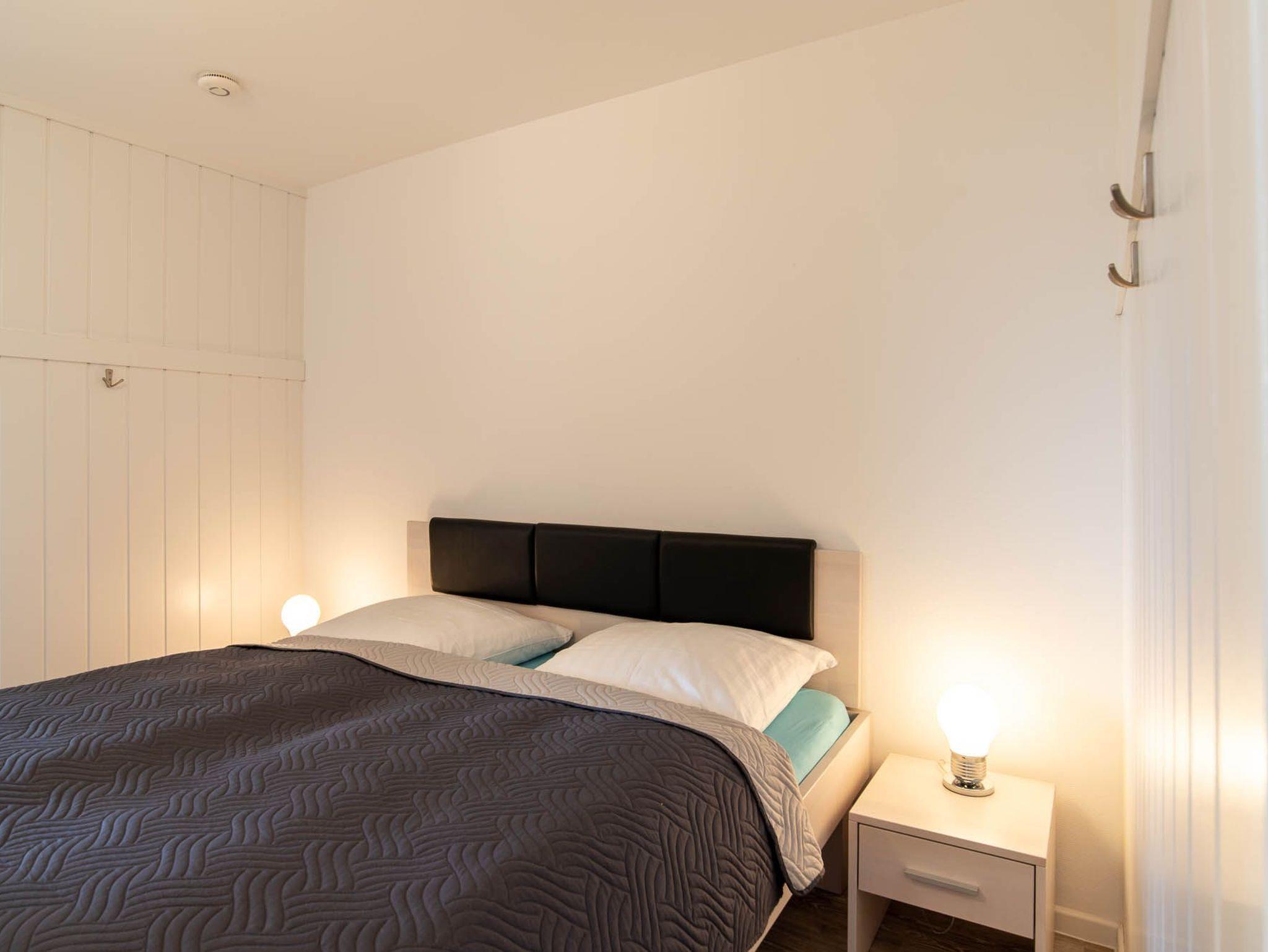 Der Schlafbereich mit einem gemütlichen Doppelbett (180x200) ist durch eine Wand vom Wohnraum abgetrennt. In einem separaten Zimmer gibt es einen Schreibtisch und ein Einzelbett (90x200) für eine dritte Person. Dieser Raum kann mit Plissees abgedunkelt werden. Das moderne Badezimmer verfügt über eine große Walk-in-Dusche, einen großen Spiegel und eine Handtuchheizung. Vom Balkon aus hat man einen wunderbaren seitlichen Meerblick über die Strander Bucht. Dort steht ein Tisch mit drei Stühlen zur Verfügung.