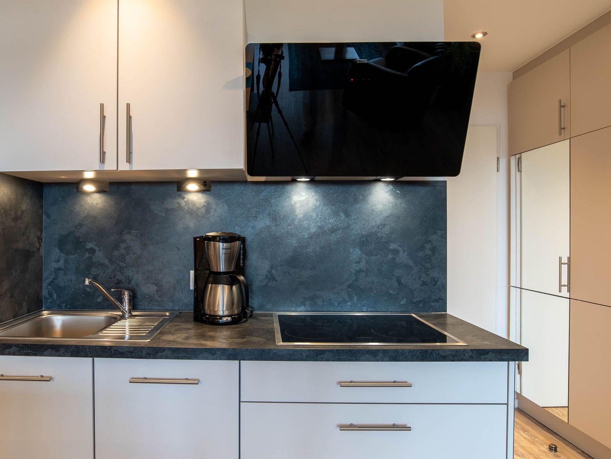 Diese 47qm große, 2-Zimmer Ferienwohnung mit seitlichem Meerblick bietet Platz für bis zu 3 Personen und befindet sich im 4. Stock des Olympia Hotel Schilksee. Die Wohnung wurde komplett renoviert und ist modern und geschmackvoll eingerichtet. Sie ist bequem mit dem Fahrstuhl erreichbar. Der offene Wohn- und Essbereich ist lichtdurchflutet und verfügt über eine komfortable Leder-Couch, einen Ledersessel, einen LCD-Fernseher und einen Esstisch für drei Personen. Durch Gardinen kann der Raum abgedunkelt werden. Die angrenzende Küche ist mit einem Induktionskochfeld, einem separaten Backofen auf Griffhöhe, einer Kühl- Gefrierkombination und einem Geschirrspüler ausgestattet. Auch eine Kaffeemaschine, ein Toaster und ein Wasserkocher sind vorhanden.