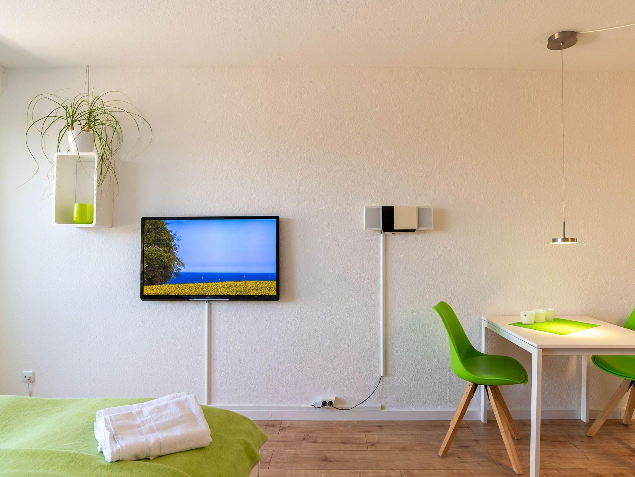 Der kombinierte Wohn- und Schlafraum verfügt über ein Doppelbett in der Größe von 160x200 cm mit getrennten Matratzen. Von hier, oder von dem schicken Sessel aus, können Sie bequem fernsehen. Neben einem LCD-Fernseher ist die Wohnung zudem mit einer Stereoanlage ausgestattet.