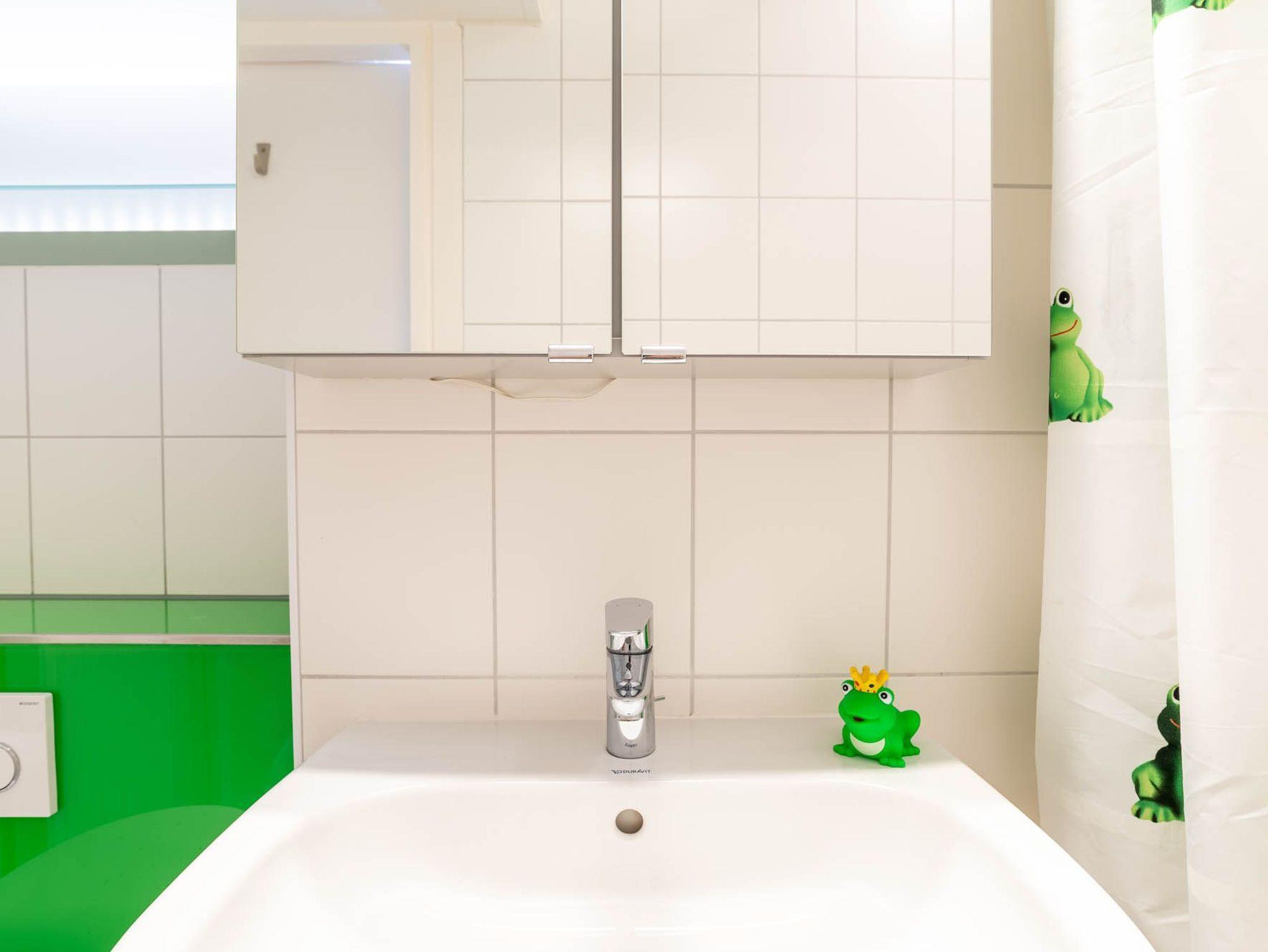 Das Duschbad ist hell, freundlich und durch die Farbgestaltung auf den Froschkönig abgestimmt. Im Flur befindet sich ein Schrank, der während Ihres Aufenthalts ausreichend Stauraum bietet.