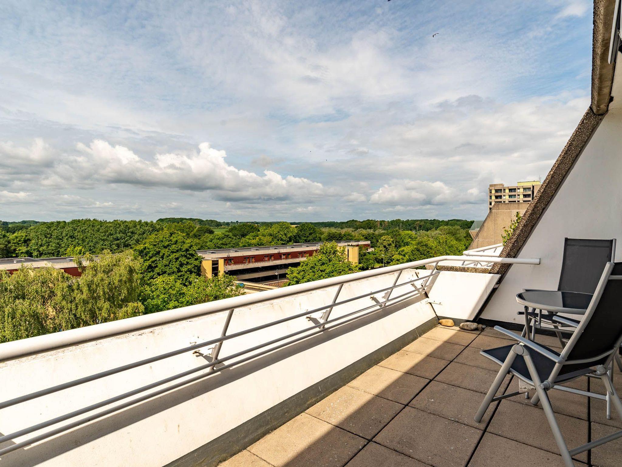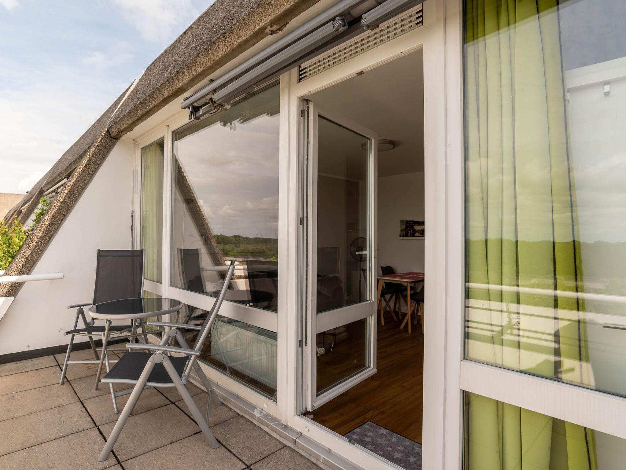 Zu dieser Wohnung gehört ein 9 qm großer Balkon mit Hochlehner-Stühlen und ein Tisch. Der freie Blick zu den Salzwiesen ist ruhig und Sie können den ganzen Tag die Sonne genießen (Süd-West-Lage).