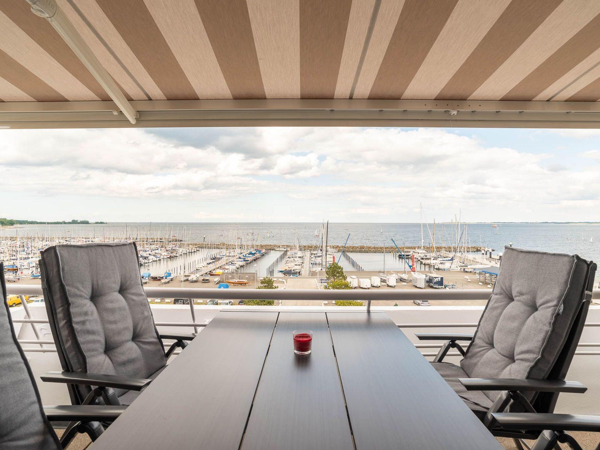 Der 12qm² große Balkon verfügt über einen robusten Gartentisch sowie vier Stühle und einer Gartenbank. Von hier lässt sich wunderbar der Hafen und das Treiben auf der Ostsee beobachten. Vor der Morgen- und Mittagssonne schützt eine ausfahrbare Markise.