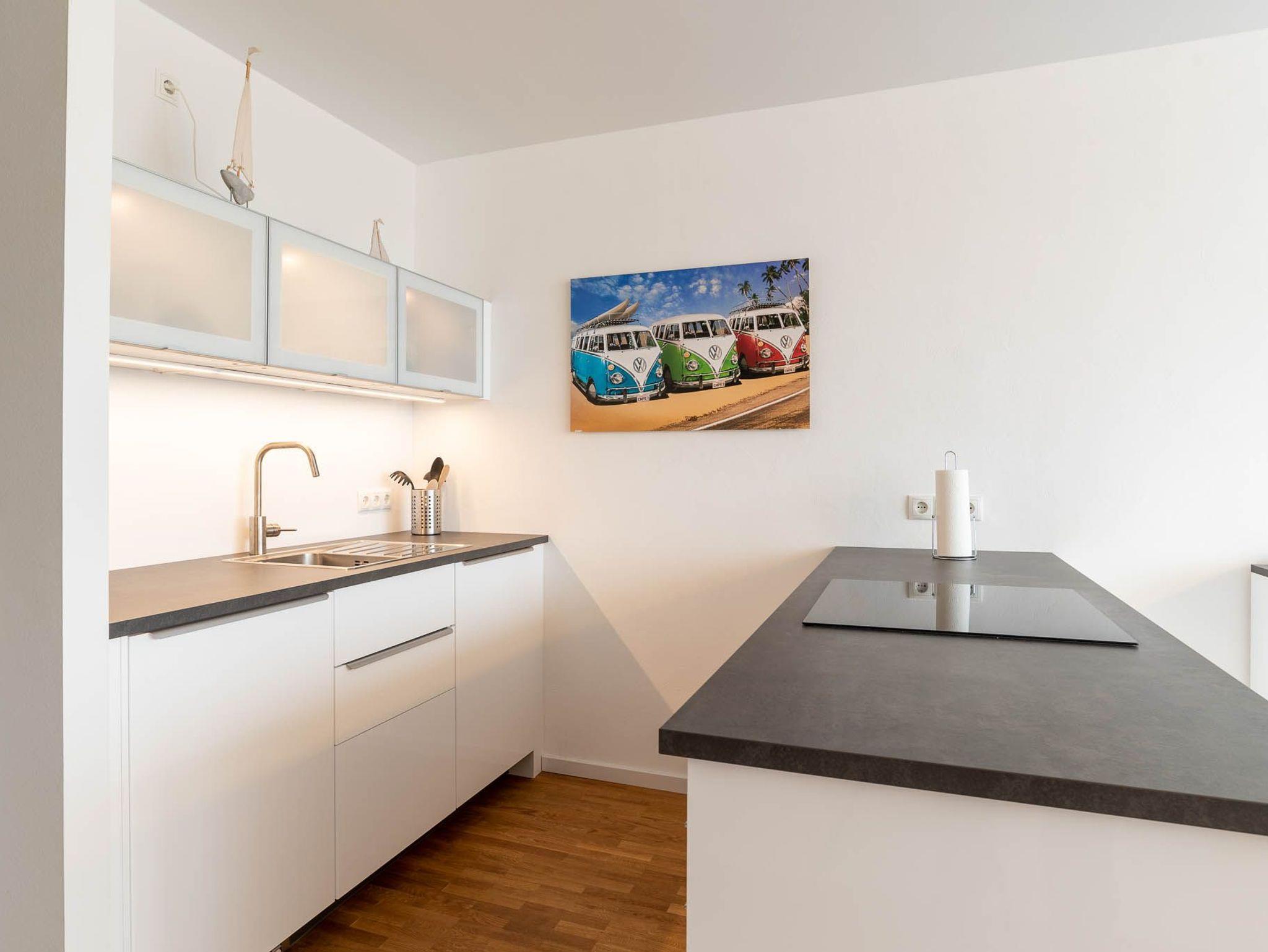 Mit einem Induktionskochfeld, Kühlschrank, Backofen, Wasserkocher und einer Kaffeepadmaschine ist die offene Pantry-Küche eingerichtet und ausgestattet. Auch eine Geschirrspülmaschine steht Ihnen zur Verfügung. Am angrenzenden Esstisch kann man gemütlich zu viert sitzen und essen.