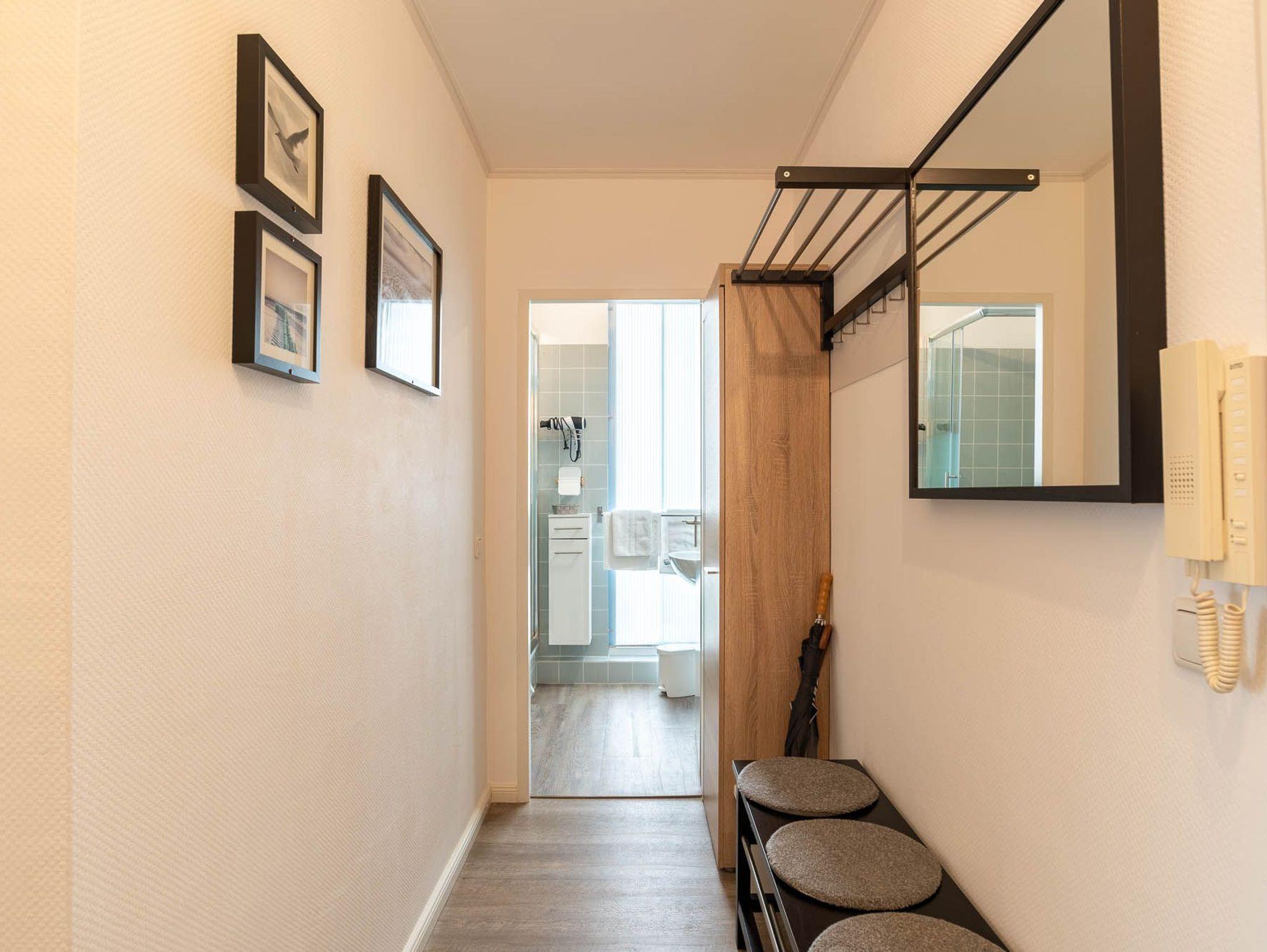 Das Duschbad ist hell gefliest und hat ein Fenster. Der kleine Flur mit Schrank und Flurgarderobe, mit ausreichend Ablagemöglichkeiten während Ihres Aufenthaltes, runden die 47 qm große Wohnung ab.