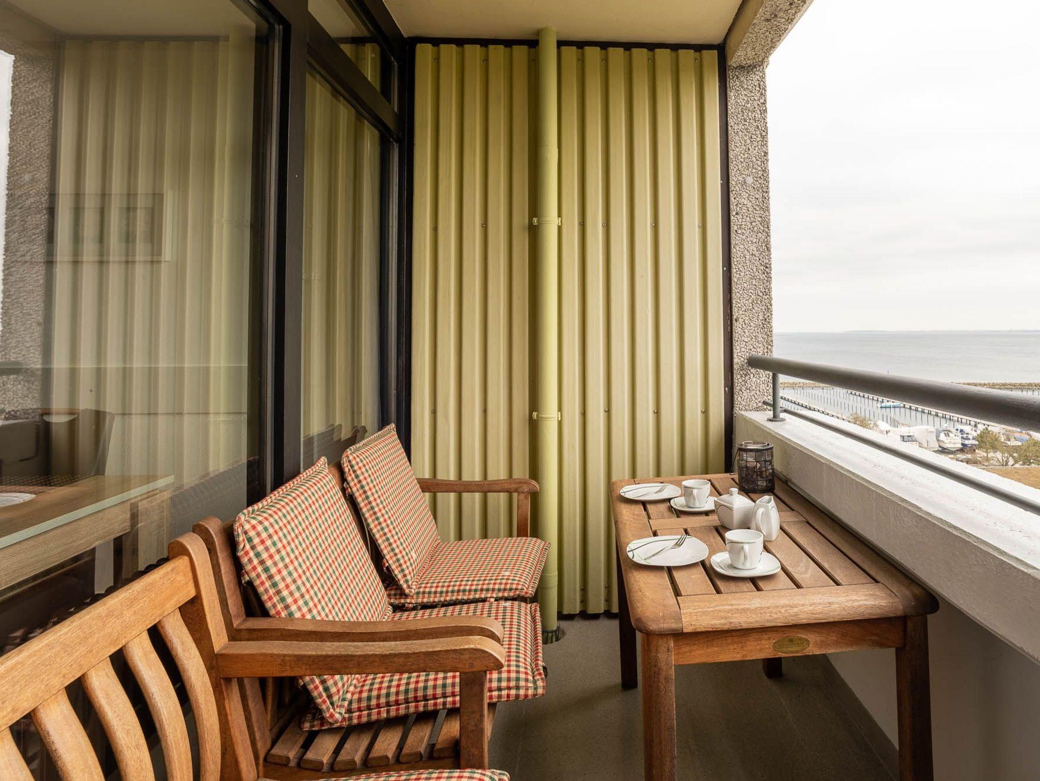 Ein Highlight der Wohnung ist der Balkon mit dem traumhaften Blick über den gesamten Schilkseer Yachthafen und der Kieler Förde. Dadurch, dass sich das Appartment im 9. Stockwerk befindet, können Sie von hier aus alle Schiffsbewegungen überblicken und verfolgen. Eine Gartengarnitur aus Holz lädt hier zum Verweilen ein.