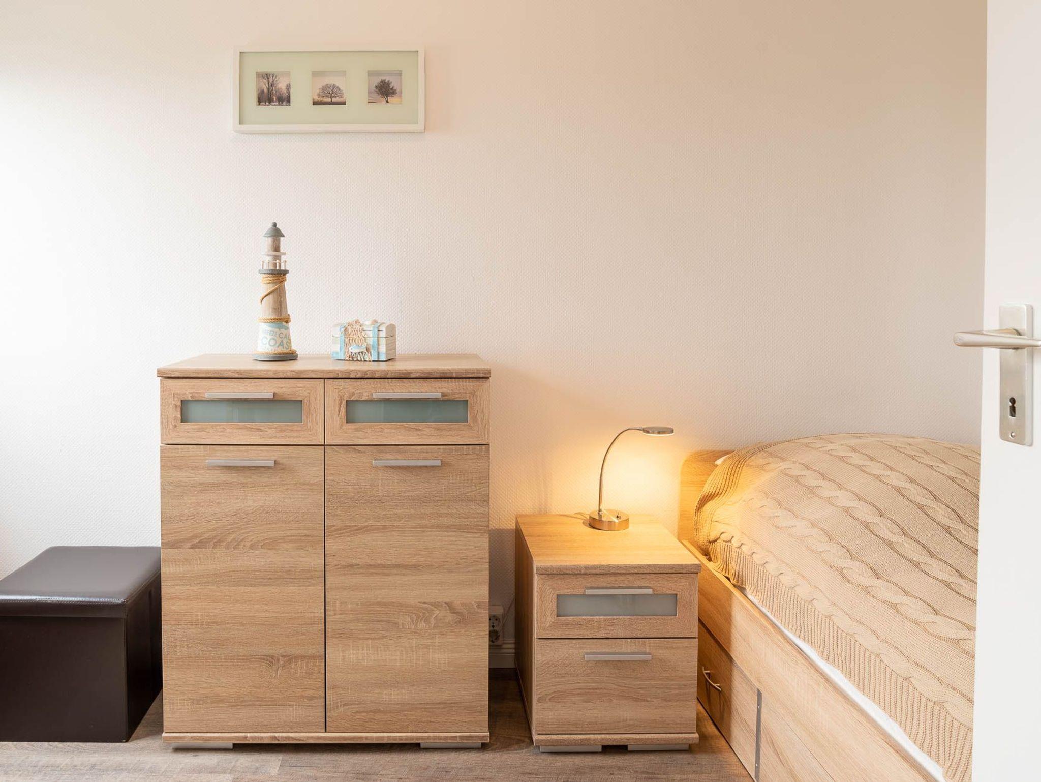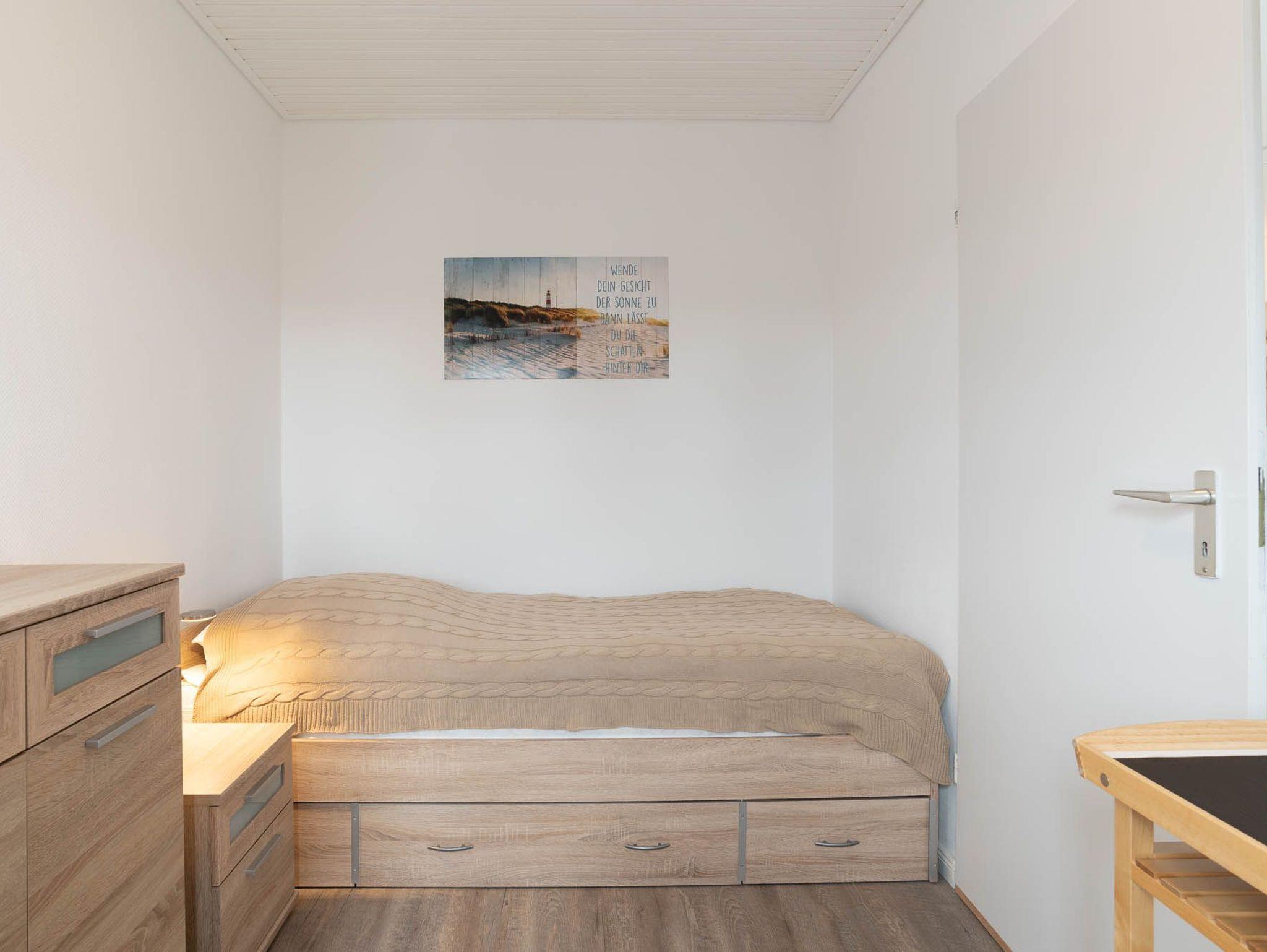 Das Boxspringbett (Liegefläche 180x200 cm) ist durch eine Wand und zwei Vorhänge vom Wohnbereich getrennt. Dies ist der Schlafbereich für 2 Personen. Im halben, kleineren Zimmer befindet sich ein Einzelbett mit einer Liegefläche von 90 x 200 cm für eine dritte Person. Auch von dem Fenster aus haben Sie eine exklusive Sicht auf die Kieler Förde. Das Zimmer lässt sich selbstverständlich verdunkeln.