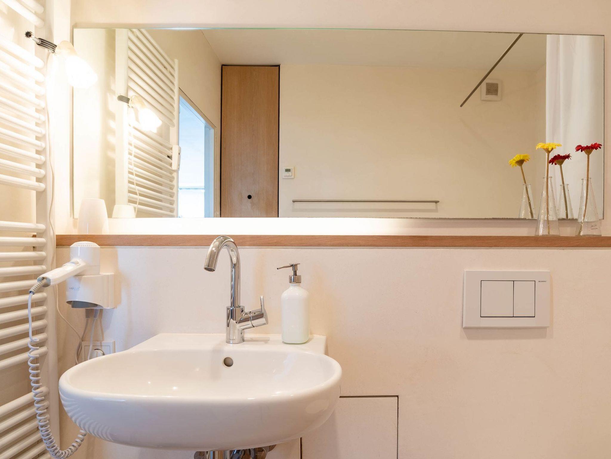 Die Wohnung ist mit einem Wannenbad ausgestattet. Im großen Wandschrank befindet sich ausreichend Platz für Ihre Kleidung. Zusätzlich ist hier eine Waschmaschine integriert.