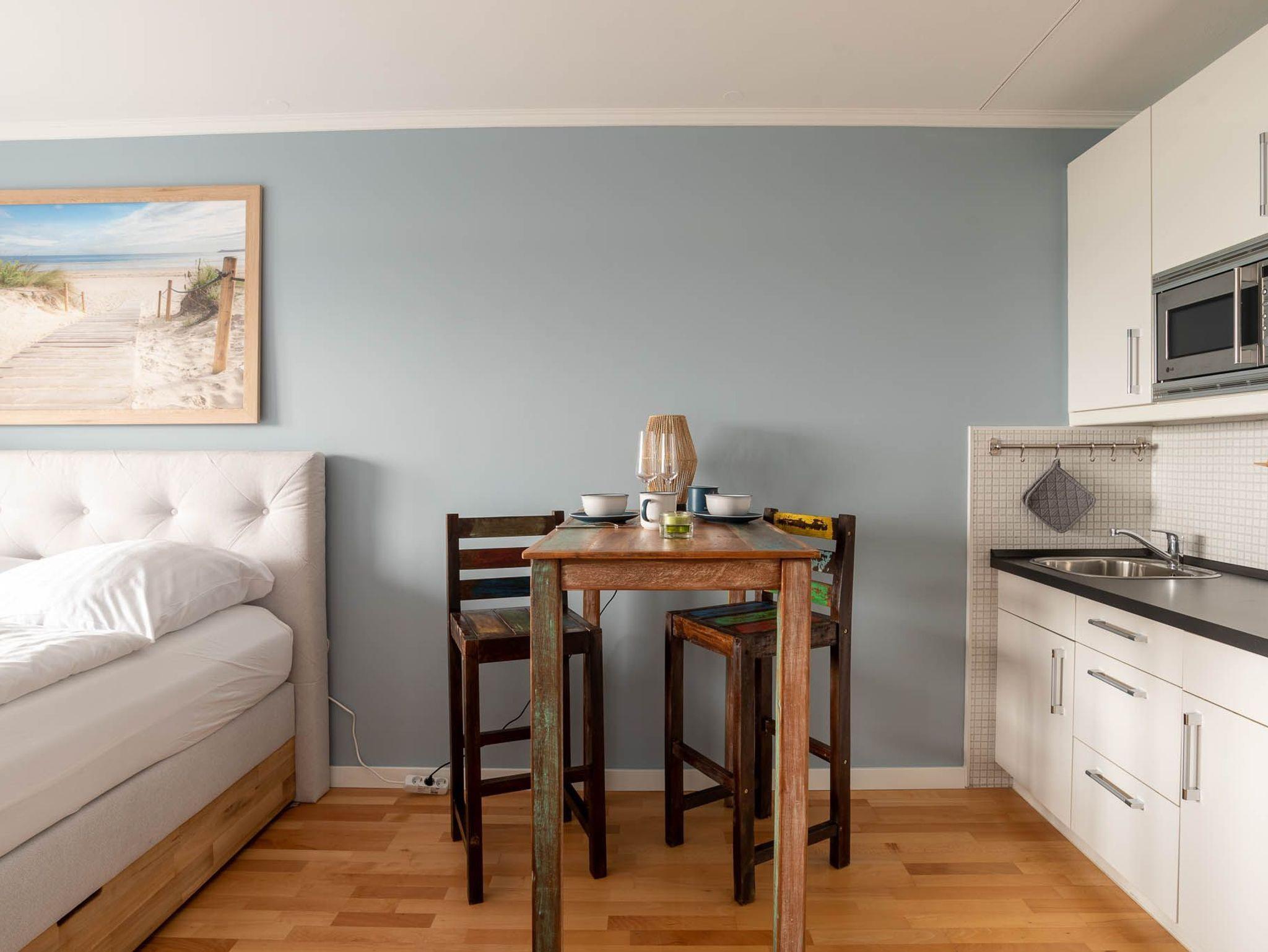 Die angrenzende offene Einbauküche hat folgende Ausstattung: ein Kühlschrank, ein Cerankochfeld mit zwei Kochfeldern, sowie eine Mikrowelle. Hinzu kommen eine Kaffeemaschine, Toaster, Wasser-, und Eierkocher. Einem gemütlichen Frühstück kann nichts im Wege stehen. Hierfür steht im Appartement ein Bartisch mit zwei Barhockern. Auch der Balkon ist mit Gartenmöbeln ausgerüstet.