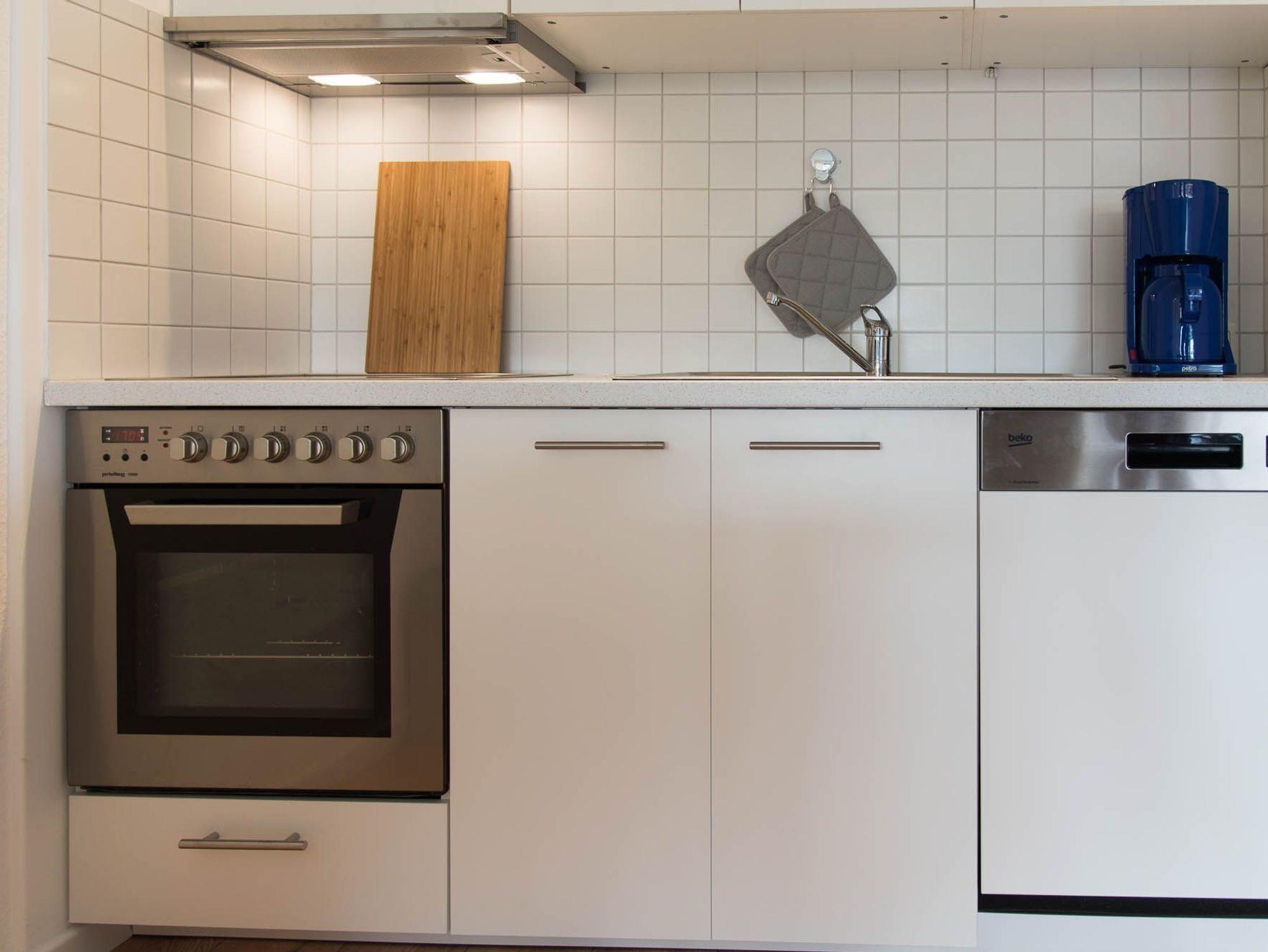 Die Ferienwohnung ist mit einer Wohnküchenzeile ausgestattet. Neben der Grundausstattung wie einem Backofen, Cerankochfeld, Wasserkocher, einer Kaffeemaschine und ausreichend Geschirr, ist auch eine Geschirrspülmaschine vorhanden. Mit dieser Ausstattung steht einer selbstgemachten Mahlzeit nichts mehr im Wege. Ein Küchenschrank als Tresen grenzt die Küche geschickt vom Wohnbereich ab.