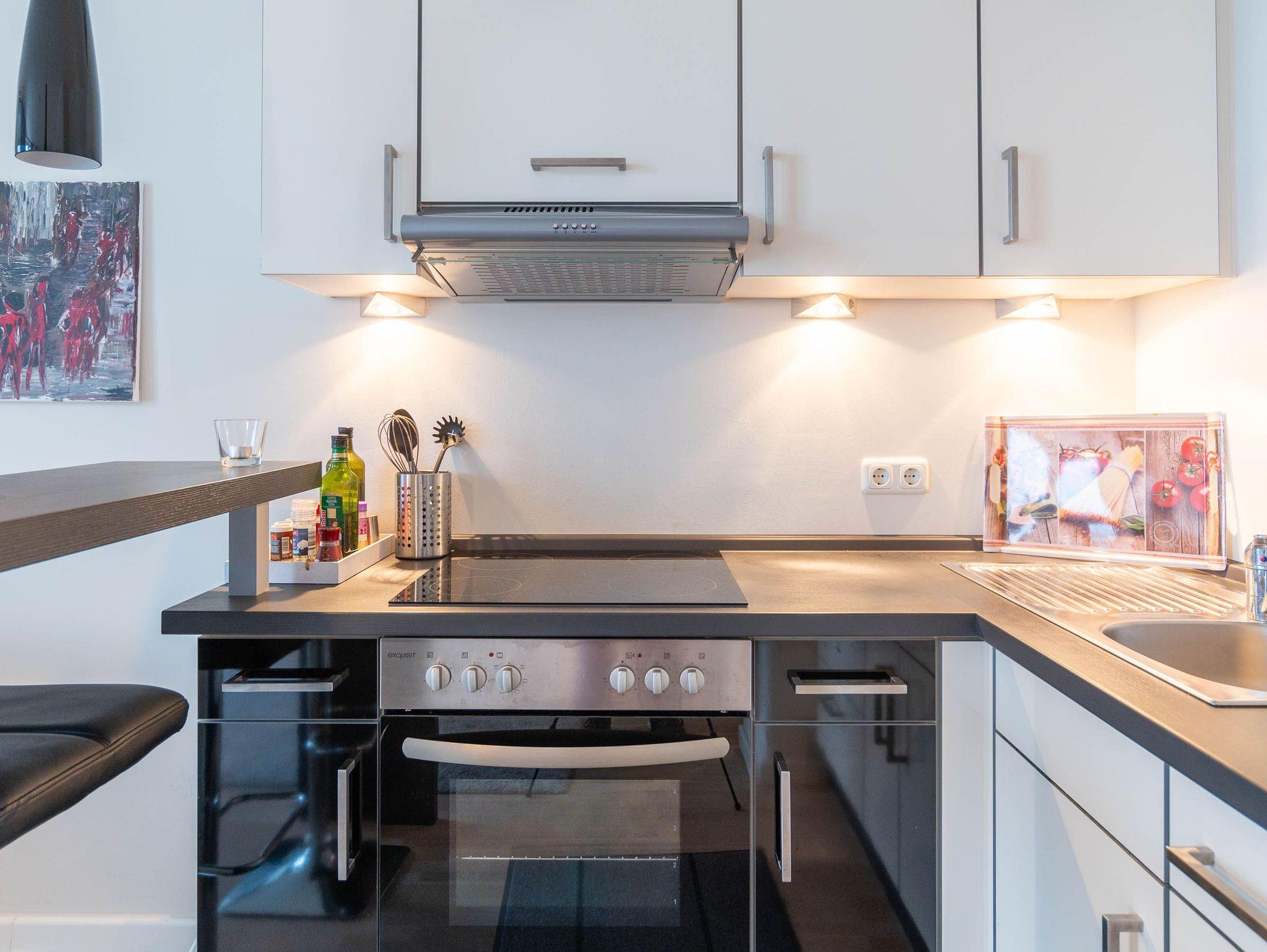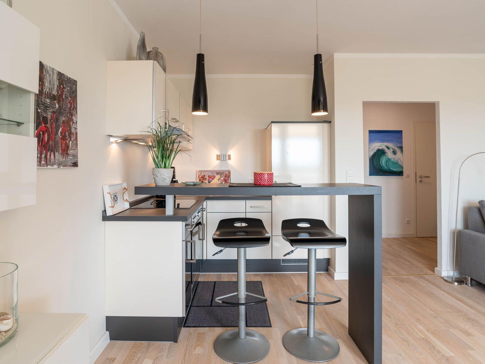 Die offene Küchenzeile wird optisch durch einen Küchentresen und zwei Barhockern vom Rest der Wohnung getrennt. Die moderne Küche ist komplett eingerichtet, und hat alles, was Sie zum Kochen brauchen: Es befindet sich in der Küche ein Ceran-Kochfeld mit Backofen und ein Kühlschrank mit Gefrierfach. Gläser, Porzellan, Töpfe und Besteck sind für 4 Personen vorhanden.