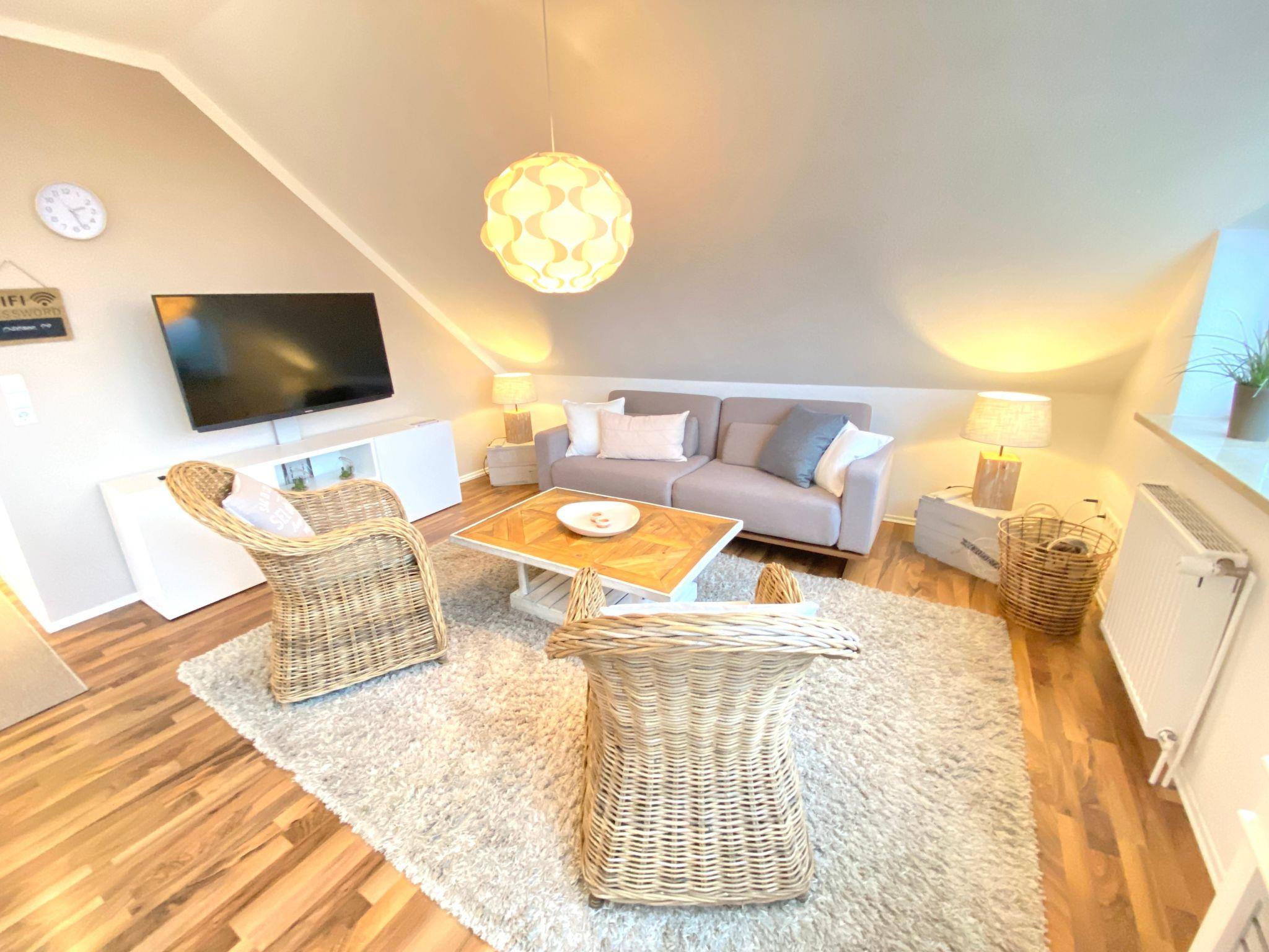 The cosy holiday apartment renovated in 2011 in the Kiel district of Wellsee measures 56m² and has a generous living room with an open kitchen. It has a bedroom with a double bed and two further people can sleep on the sofa bed. The apartment is on the upper floor of the building built in 1994, adjoined to the historical old building from the year 1880. The six heritage-protected linden trees on site complete the harmonious scene. The apartment has a big glass front to the rear, affording an unobstructed view over the meadows and moor area behind. The apartment has free wireless Internet access. The kitchen is equipped with a ceramic hob, a convection oven and an infrared grill, a fridge, dishwasher, coffee machine, microwave, toaster and washing machine. The bedroom has a double bed 180cm wide, while the living room has a big sofa bed for two people and a dining corner with four chairs, as well as a 37” TFT television with digital satellite TV and a DVD player, as well as a stereo system with a CD player, a USB port and Line-In (AUX). The bathroom includes a hairdryer. An iron, ironing board and cot are available.