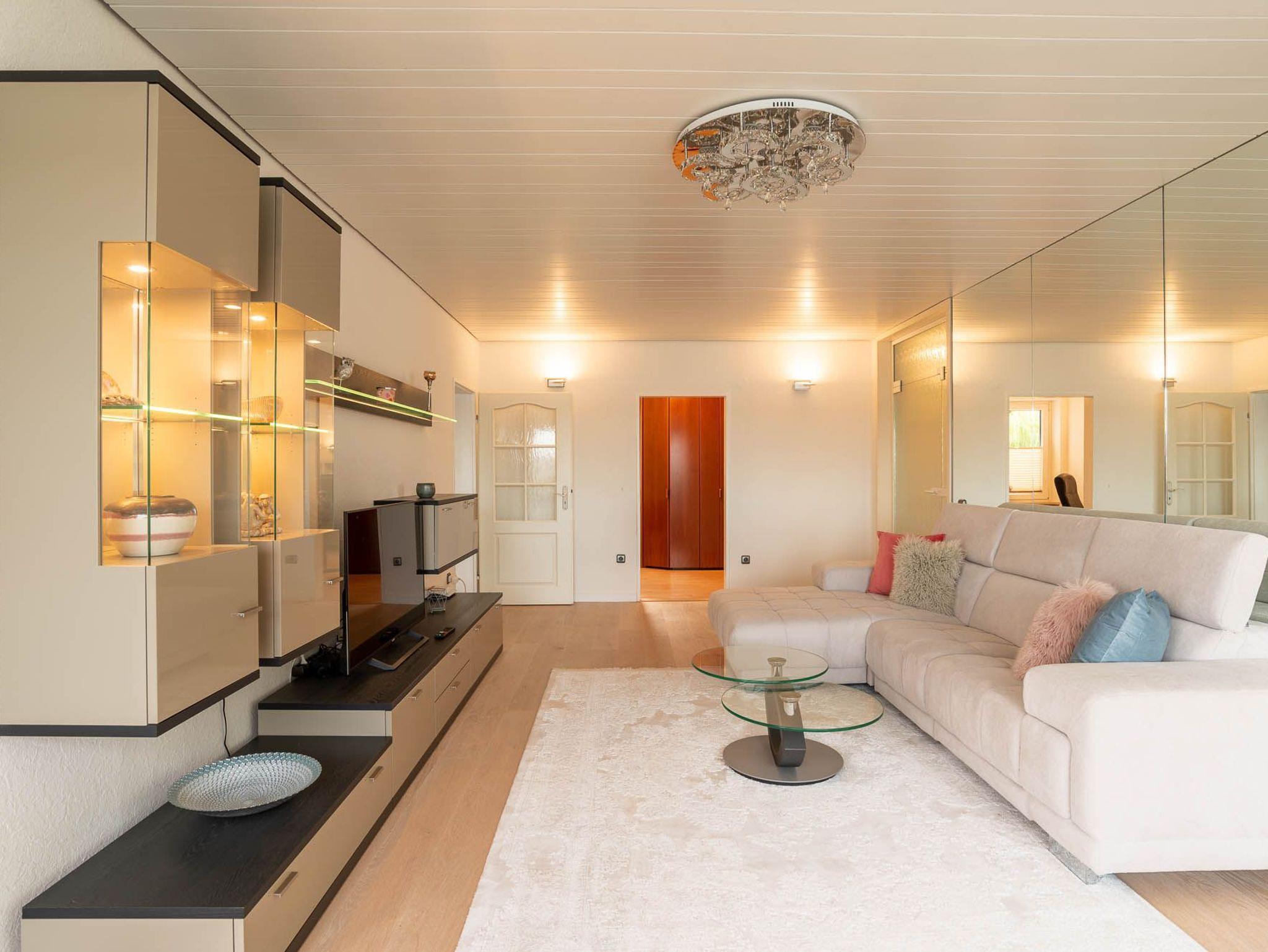 Neben einer großen Couchlandschaft und einem Lowboard mit Flachbildfernseher befindet sich als Highlight im Wohnzimmer eine Spiegelwand hinter dem Sofa. Der Esstisch mit sechs Stühlen steht direkt an der Fensterfront mit Blick zur Kieler Förde, beziehungsweise dem Yachthafen Düsternbrook
